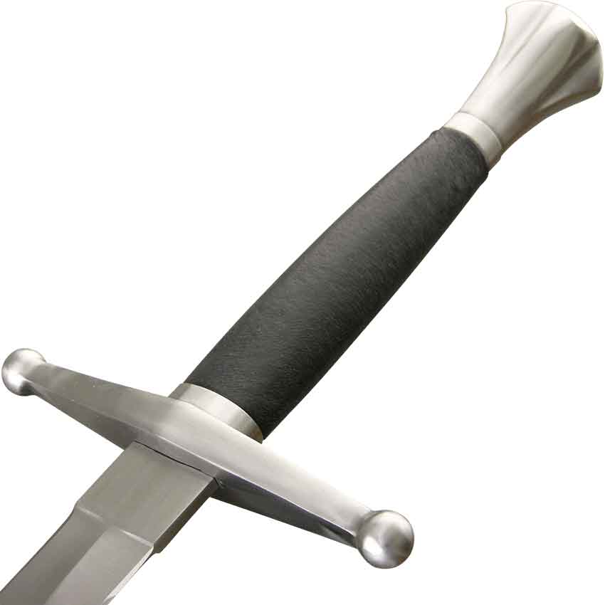 The 14th century marked the beginning of the infamous Hundred Years War between England and France, which lasted well into the 1400s. This 14th Century War Sword is designed after the weapons used by soldiers throughout this turbulent century. This hand and a half style sword is forged from 1566 high carbon steel for enhanced functionality and durability. Ball tipped quillons extend from the steel guard, adding an eye catching and authentic touch. The hardwood grip is leather wrapped for a strong but comfortable feel, while the elongated scent stopper pommel allows for two handed use. This sword comes included with a scabbard with suspension rings for carrying as well. Reenact an intense battle from the Hundred Years War with incredible authenticity with the 14th Century War Sword!