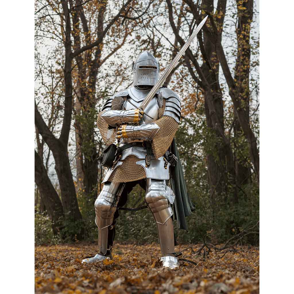 Any knight in his right mind uses steel gauntlets to protect his fingers from the blows of his opponent. The 15th Century German Style Gauntlets with Brass serve as a complex yet beautiful addition to any set of plate armour. Fiore dei Liberi, an Italian master of the period, wrote that he used medieval gauntlets in all of his duels. These knightly gauntlets have been decorated with traditional German style from the end of the 15th century. Several plates – alternating with brass for a striking look – guard each finger, making this German armour a great choice for warriors.