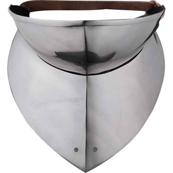 The other plate protects the neck. It points outward to allow for better movement of the neck. The plate also has a central ridge. Its top edge features a point in the middle as well. Rivets secure the strap to the back of the top plate. Wear the 15th Century Infantry Gorget to your next historical reenactment. It looks great on a variety of characters.