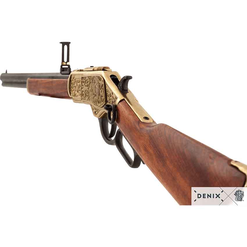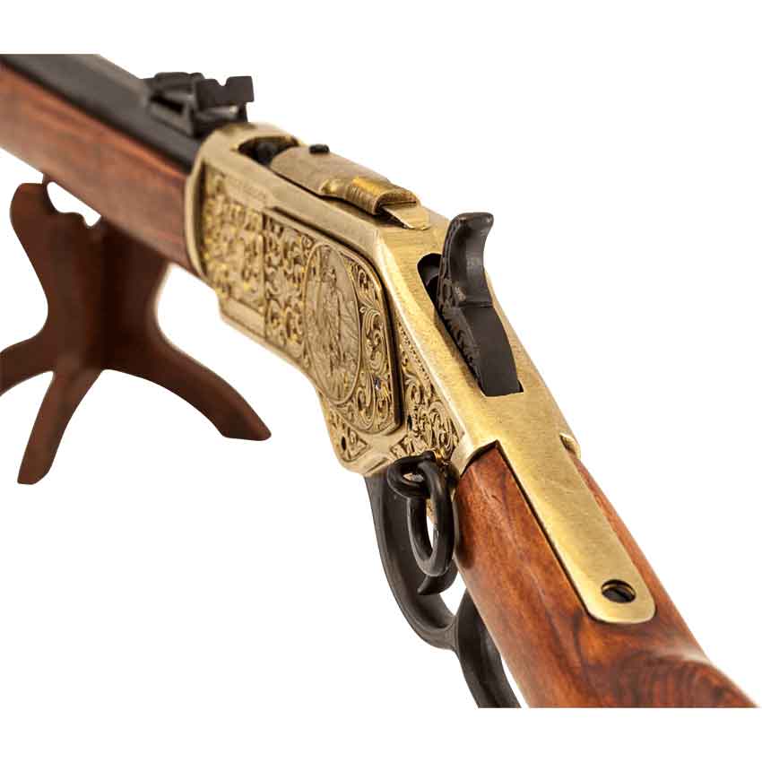 Famous for its rugged construction and lever-action breech mechanism that allowed the rifleman to fire a number of shots before having to reload, hence the term, repeating rifle. The first model, the Model 1866, was nicknamed Yellow Boy because of its brass receiver. The Model 73 was much more popular than the 66 because of the steel frame which allowed it to take the newly designed and more potent centerfire .44 caliber cartridge. The 1873 is often referred to as The Gun That Won The West. The 1866 was only available in .44 caliber rimfire cartridge at first, and the more modern centerfire cartridges were added to the production line later. The Model 73 was available in centerfire .44, .38 , and .32 calibers. During its production run, from 1873 to 1919, about 720,000 pieces were made in the Connecticut factory. Its tubular magazine was located underneath the barrel. This non-firing version clearly demonstrates the workings of the lever-action loading system.