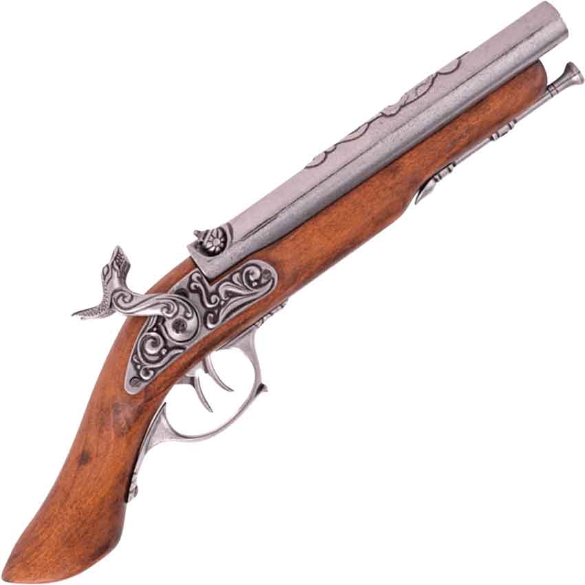 This replica flintlock pistol is perfect for historical costume use and decoration. Keep this pirate pistol as a part of your swashbuckler or pirate reenactment costume. You can display it in your flintlock pistol collection or use it in safe demonstrations. Because it was a popular weapon of choice due to its small size, this replica flintlock pistol is a great addition to a wide variety of characters.