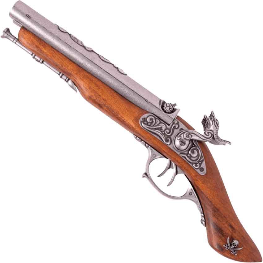 The twin barrels are silver with an embossed pirate skull on top. Each half of the skull is on the opposite barrel, complete with realistic features like eye sockets and a jaw. Below the embossed skull is more filigree. Below the barrel is a realistic silver ramrod. The triggers are silver and the trigger guard is silver. The bottom of the stock has an embossed pirate skull with crossed swords for added style.