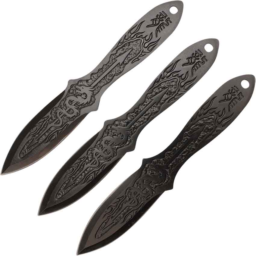 Warrior, do not forget to get as much practice as you can. Improve your skills with the 6 Inch Set of 3 Black Dragon Throwing Knives. Made from stainless steel, this set includes three black knives. Each functional knife consists of a single piece of metal. It has a double-edged blade. Its edges end at a series of points in the middle of the knife. There is ornately engraved detailing across the length of each knife. Each fantasy knife features a dragon over an arrow. There are flames at each end of the stone-like background behind the dragon. At the end of the rounded handle, there is a carved symbol. The handle also has a hole for attaching a lanyard, not included.