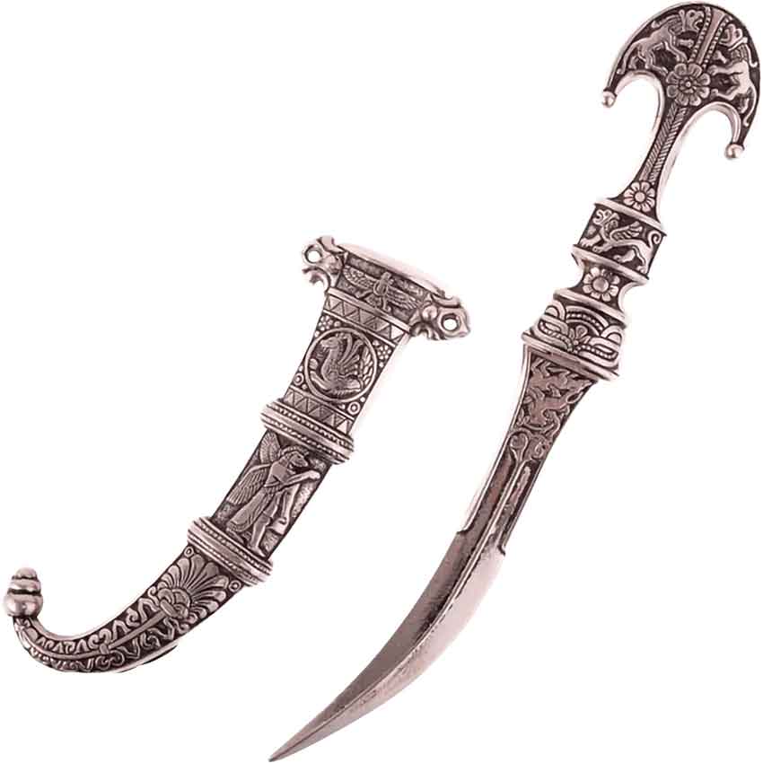 Journey back to the deserts of the Middle East and early medieval history wielding the 6th Century Silver Jambiya Dagger. This Persian dagger replica is an excellent addition to your collection.