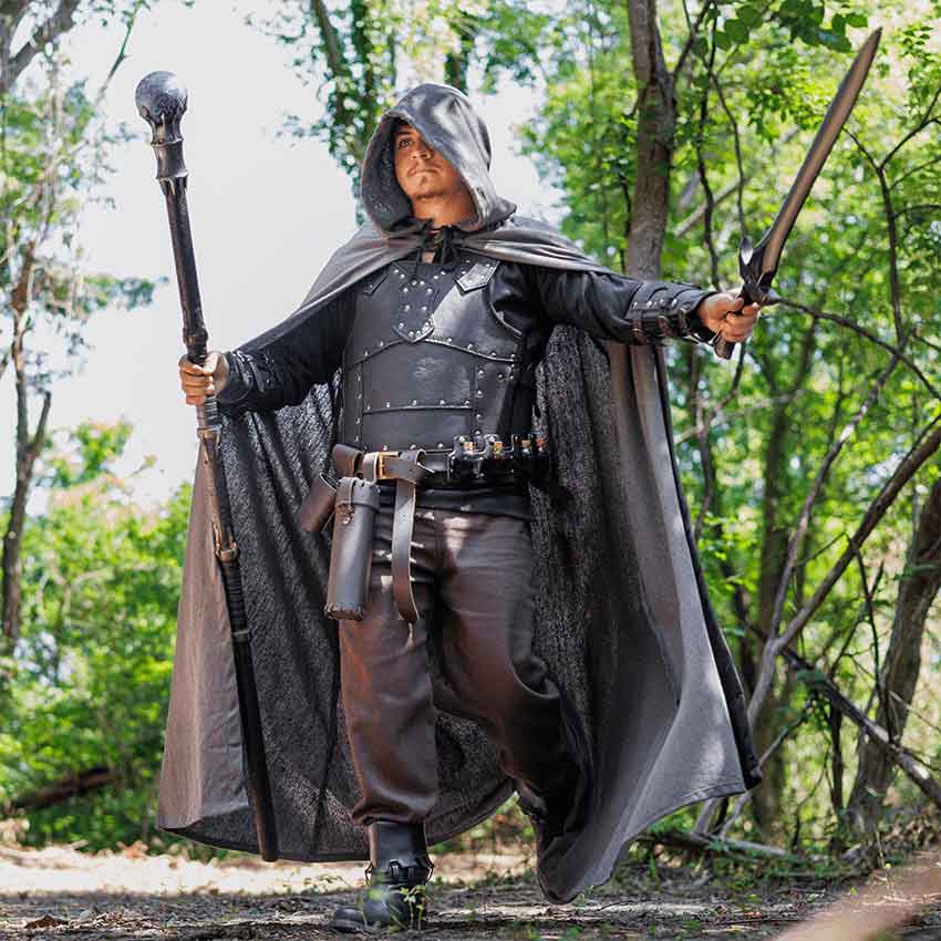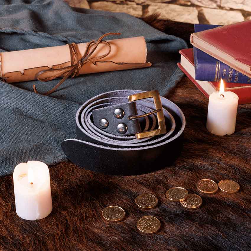 No matter if you are an adventurer, merchant, or soldier, you may find yourself in need of a great belt. Add this Adolar Belt to your fantasy outfit. This leather belt comes in two colors and a single size. It has pre-punched holes for you to adjust the fit. Also, the medieval belt has a rectangular, brass buckle. Three rivets adorn the belt near the buckle. Its streamlined look makes the belt very versatile in appearance. It works wonderfully with many different characters, from rogues to nobles. The Adolar Belt looks great at a variety of events, including Renaissance faires and conventions. You can even wear it to a LARP battle.