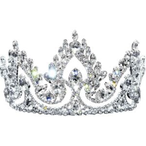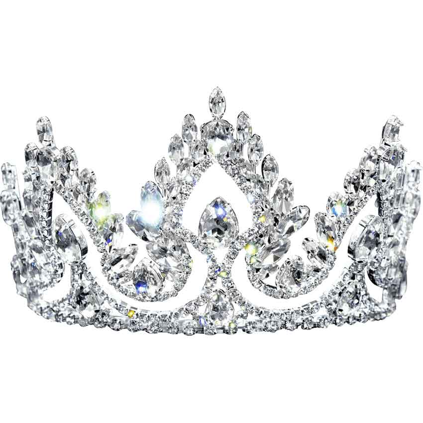 Covered in clear crystals, this queens tiara forms curved points. Cutout curves run from one point to the next. A large teardrop crystal sits at the center of each point. Small marquis crystals stand straight up along the outer edges of the points.