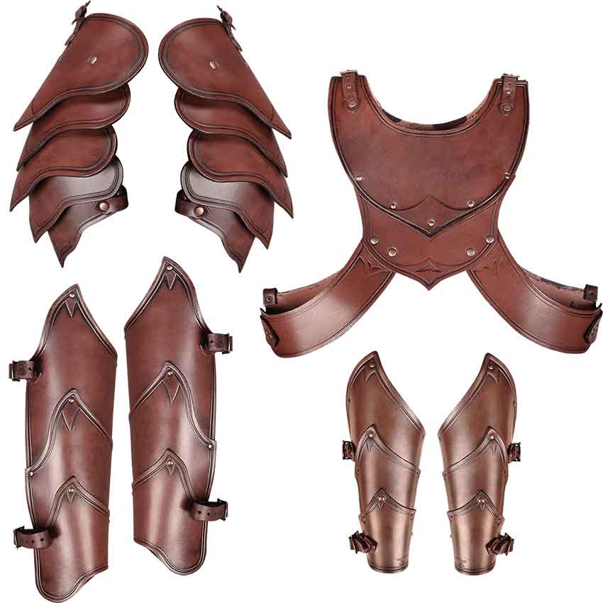 As a well-known warrior among your people, many have come to recognize you by your distinctive armour. After all, you wear the Alistair Armour Set. To begin with, this package deal includes pieces of the Alistair armour. Therefore, you will receive a pair of bracers, spaulders, greaves, and a gorget. Each piece comes in four color options. For example, you can choose from black, brown, green, or red. This set makes it much easier to buy multiple, matching pieces of armour at once. Best of all, you will save 5% on the set. Make sure to include the Alistair Armour Set with your next LARP outfit or cosplay ensemble. You can even wear it in a theatrical production.