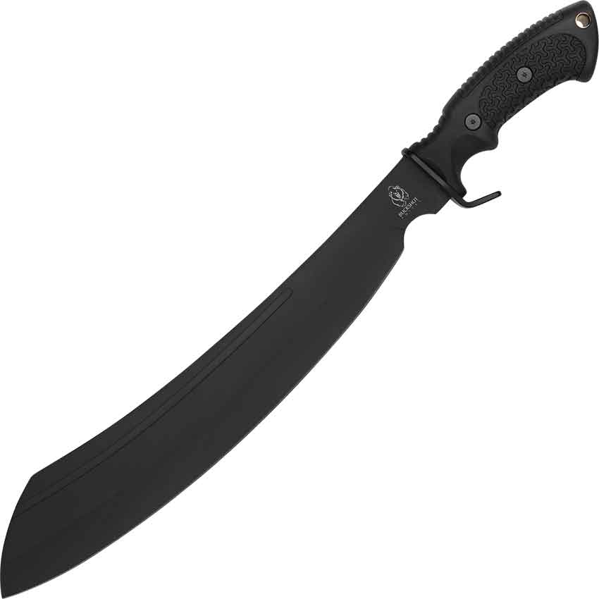 Forged as one piece from stainless steel, this tactical machete has a sleek aesthetic and it serves as a useful survival tool. Stainless steel is renowned for its durability and rust resistance. The curved sheepsfoot blade has a fuller running down the spine and is sharpened on one side. The cutting edge is silver and the rest of the blade is black. At the base, the blade has a concave choil. Along with the guard, the choil keeps your grip from slipping onto the blade.