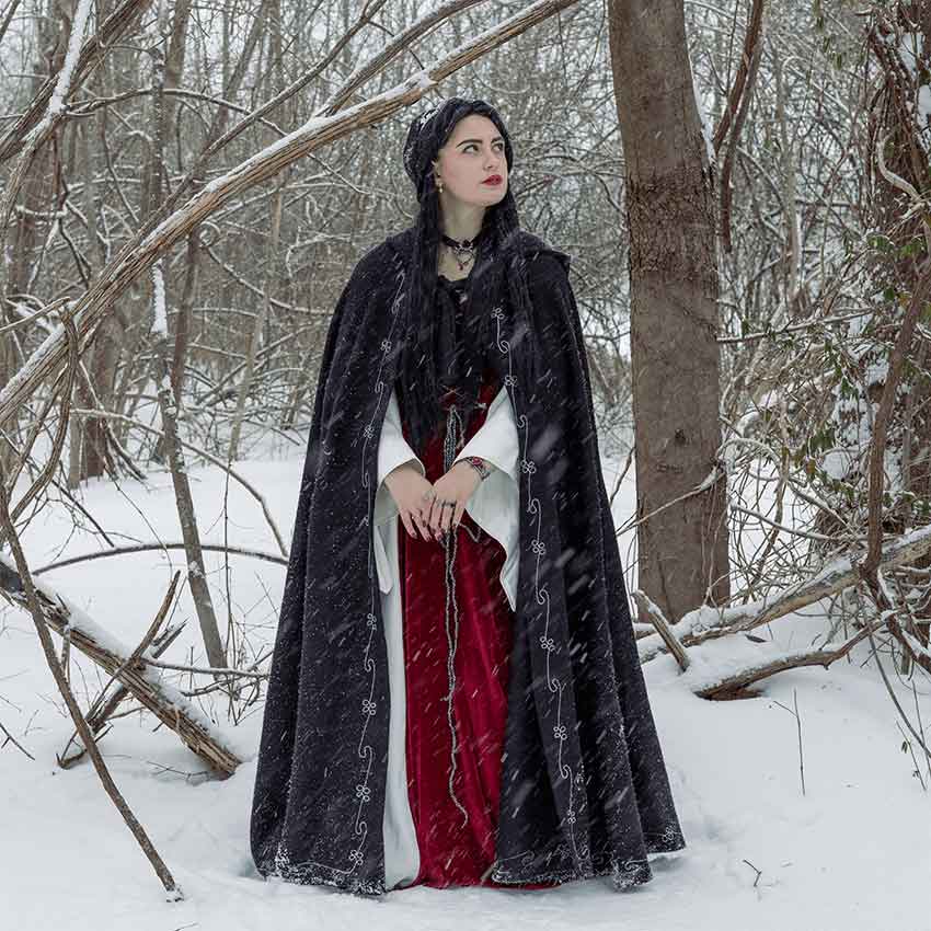 Whether won on a chill morning at the medieval market or to complete a spellcaster costume, this embroidered cloak makes a marvelous addition to your medieval wardrobe and an outerwear option you will want to reach for even for modern occasions.