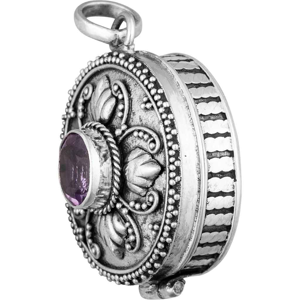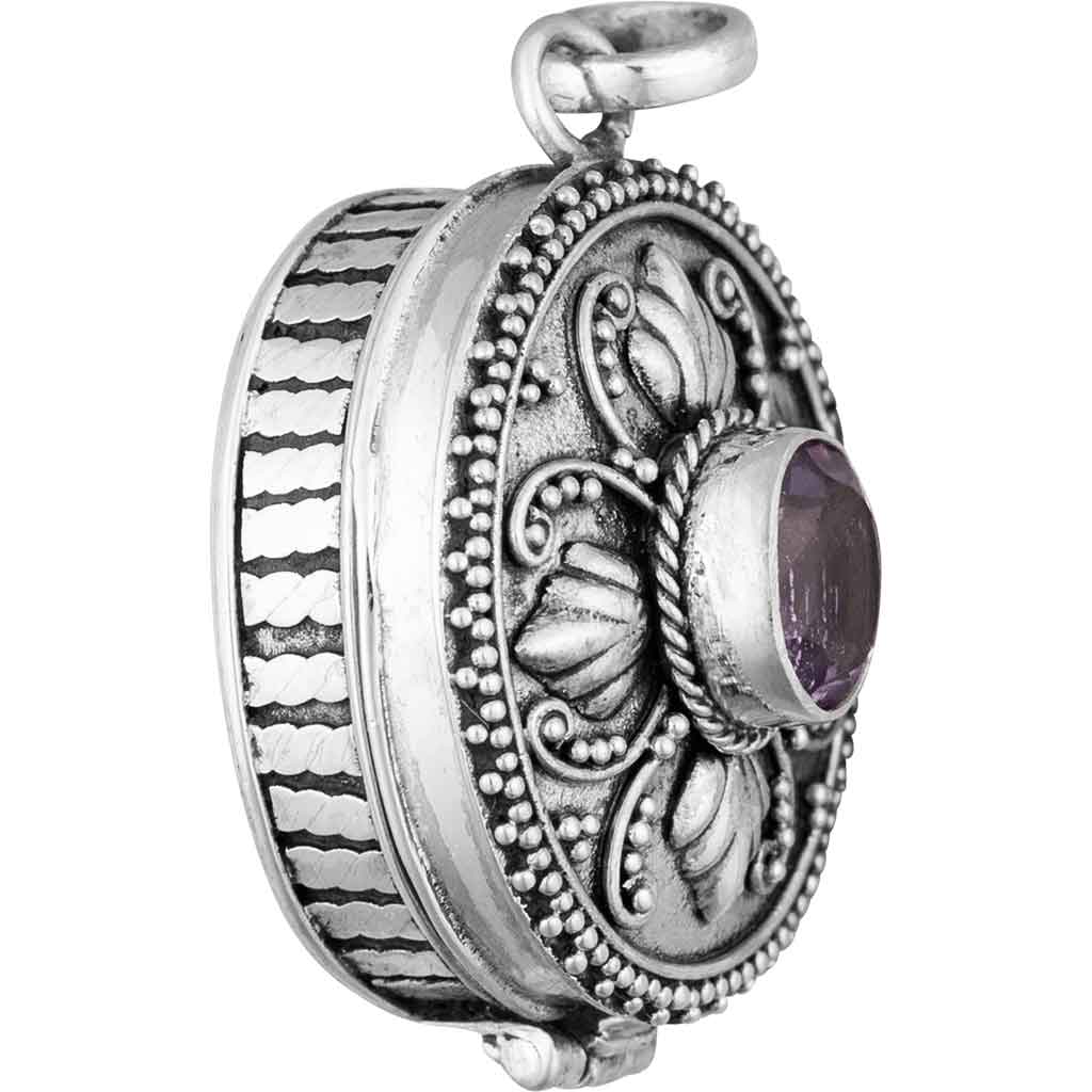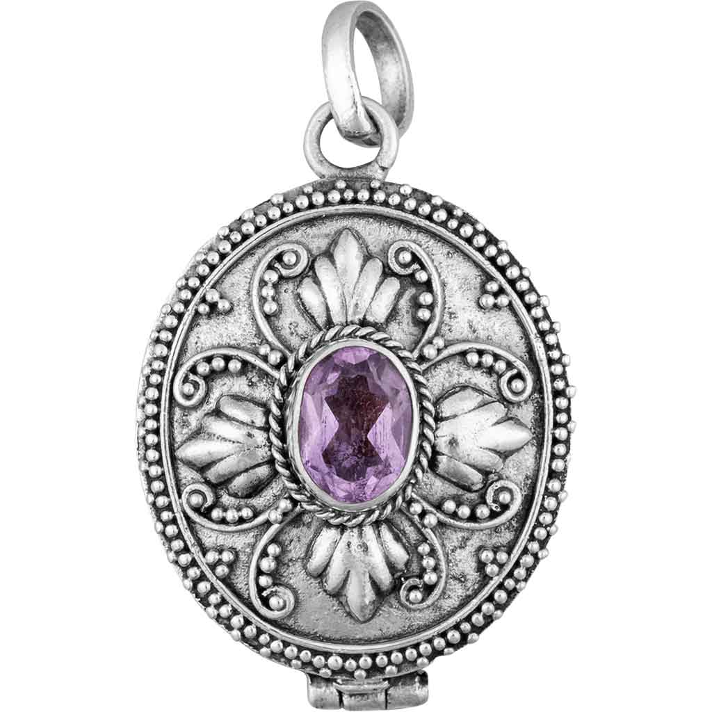 This locket pendant is crafted from 925 sterling silver, meaning it has 92.5% silver content. The center stone is a real Amethyst gemstone. The gemstone has a faceted cut and lends a stunning purple charm to the design that contrasts magnificently with the silver. The Amethyst is on a raised oval platform trimmed with twisted wire, perfect for showing it off. It’s hinged at the bottom so you can open it from the top.