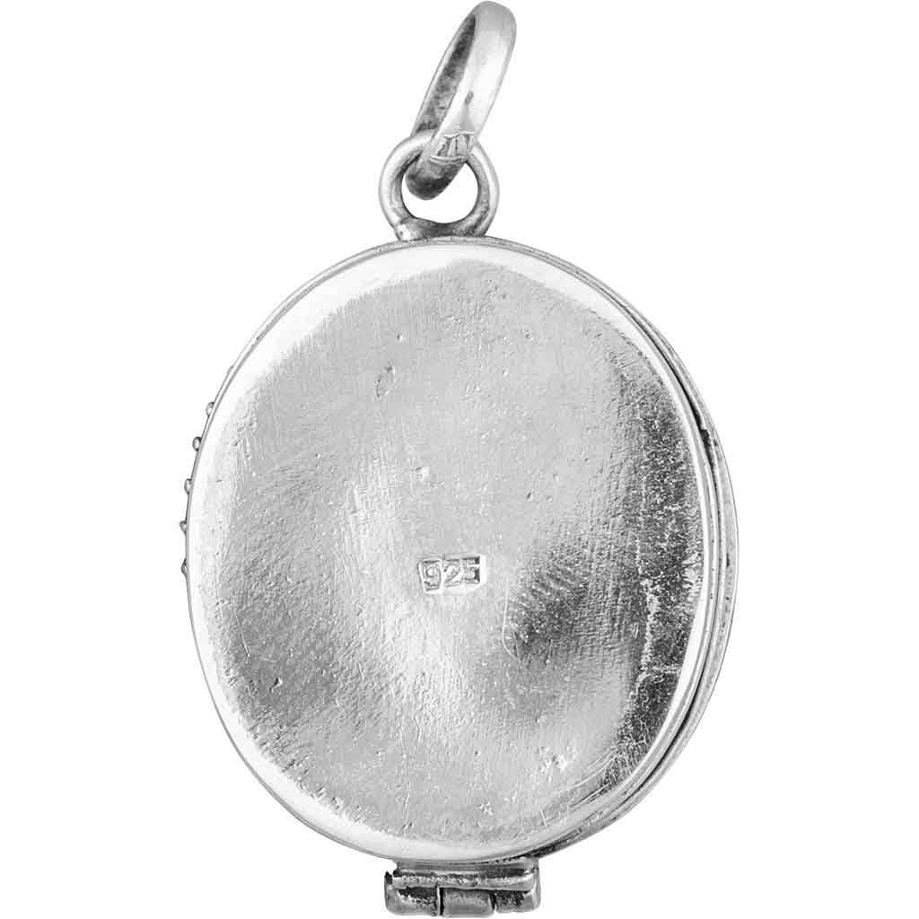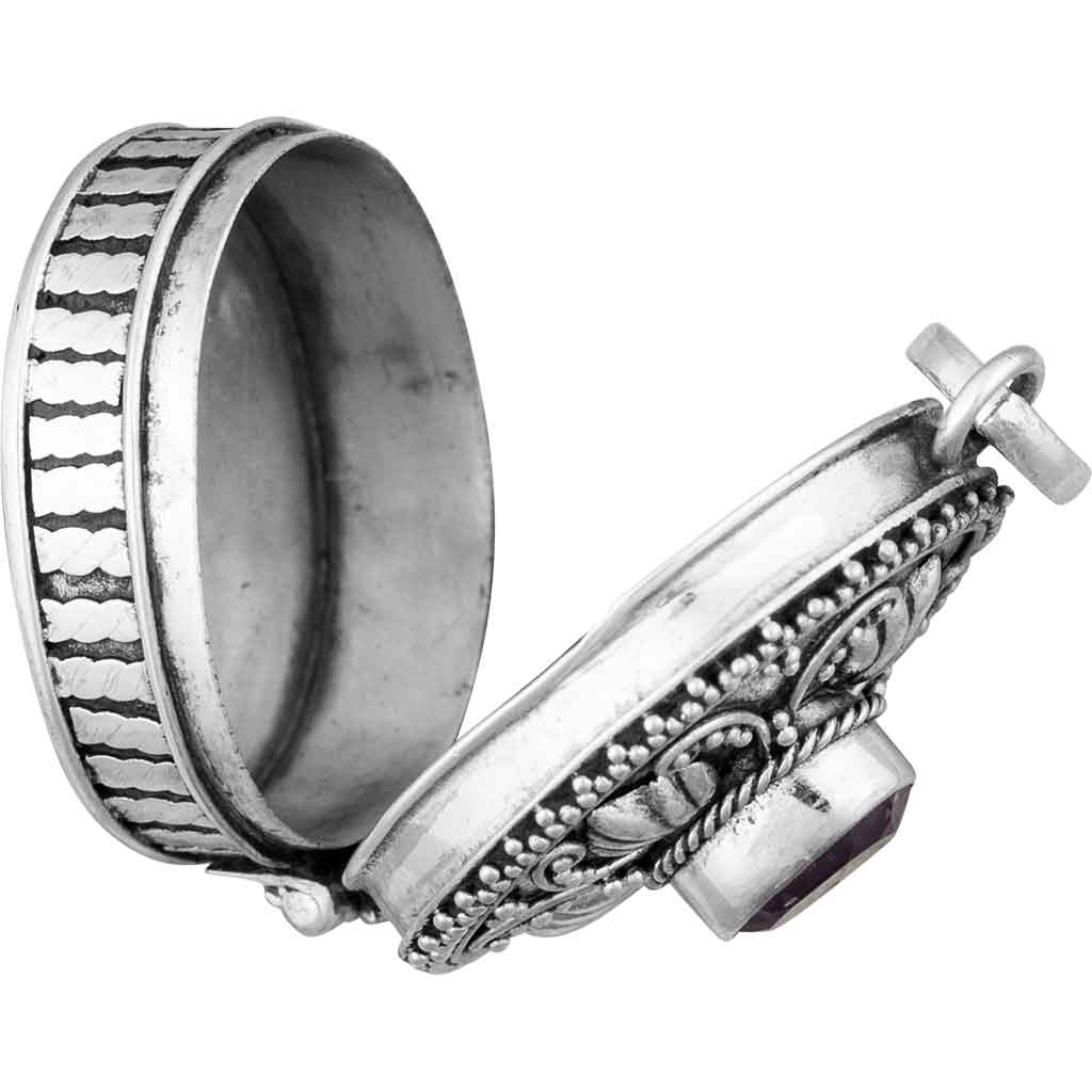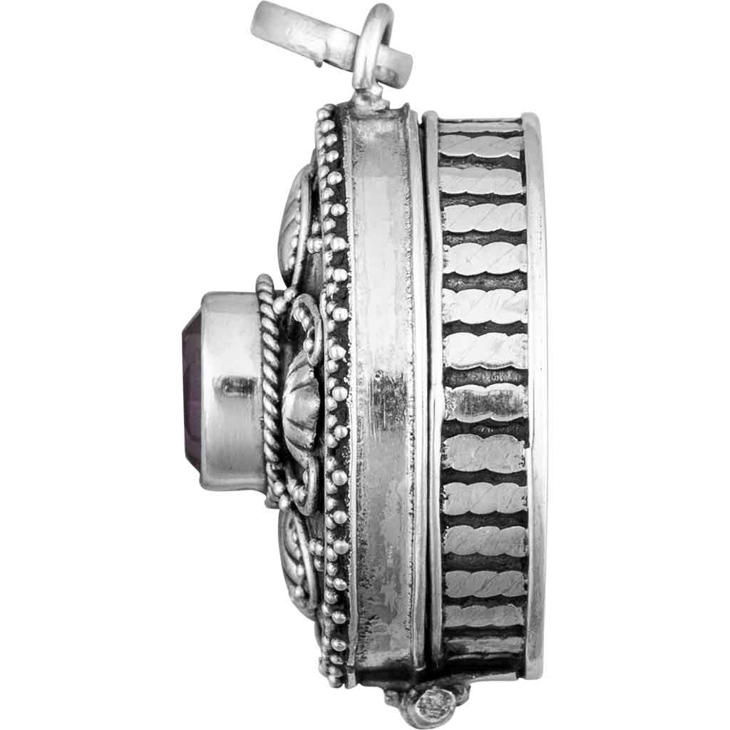 This locket pendant is crafted from 925 sterling silver, meaning it has 92.5% silver content. The center stone is a real Amethyst gemstone. The gemstone has a faceted cut and lends a stunning purple charm to the design that contrasts magnificently with the silver. The Amethyst is on a raised oval platform trimmed with twisted wire, perfect for showing it off. It’s hinged at the bottom so you can open it from the top.