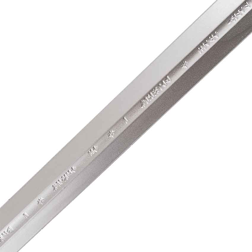 Made from foam, this sword is inspired by the legendary Anduril, Flame of the West, from the works of Tolkien and the Lord of the Rings movies. This foam sword is an excellent cosplay prop. A fiberglass core in the center makes it a strong and flexible weapon. Starting with the hilt, it has a fan-shaped silvery pommel with a hollow cut out in the center. The ribbed grip is black. Further down, the cruciform crossguard has similar fan-shaped ends. Moving down the length, the silvery blade has intricately carved elven runes along the fuller from the base to the tip.