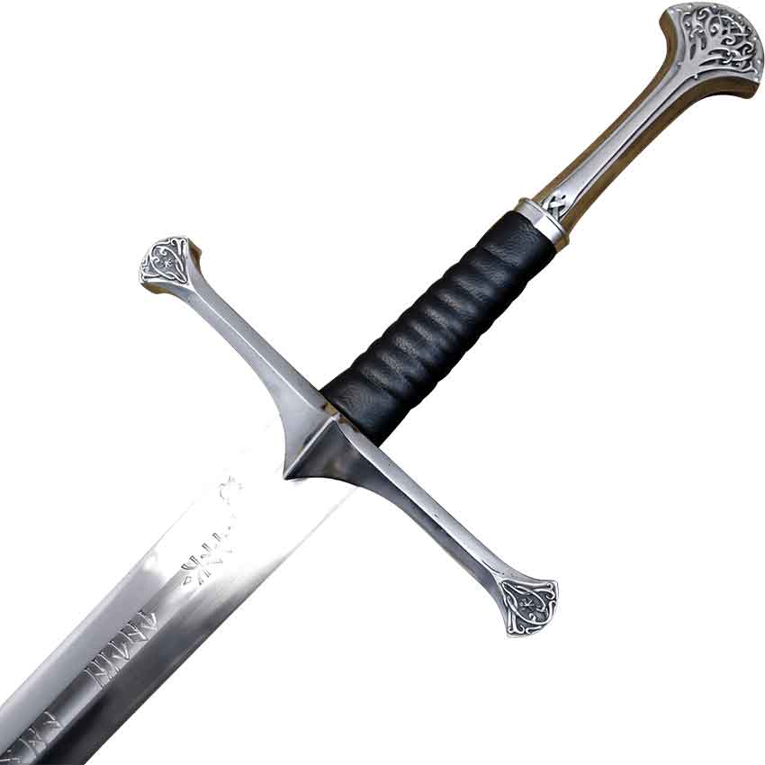 Inspired by the sword wielded by Aragorn in the Lord of the Rings, a dwarvish runic inscription adorns the fuller in the center of the blade. The inscription reads SUN. I AM ANDURIL WHO ONCE WAS NARSIL, SWORD OF ELENDIL. THE SLAVES OF MORDOR SHALL FLEE FROM ME. MOON.
