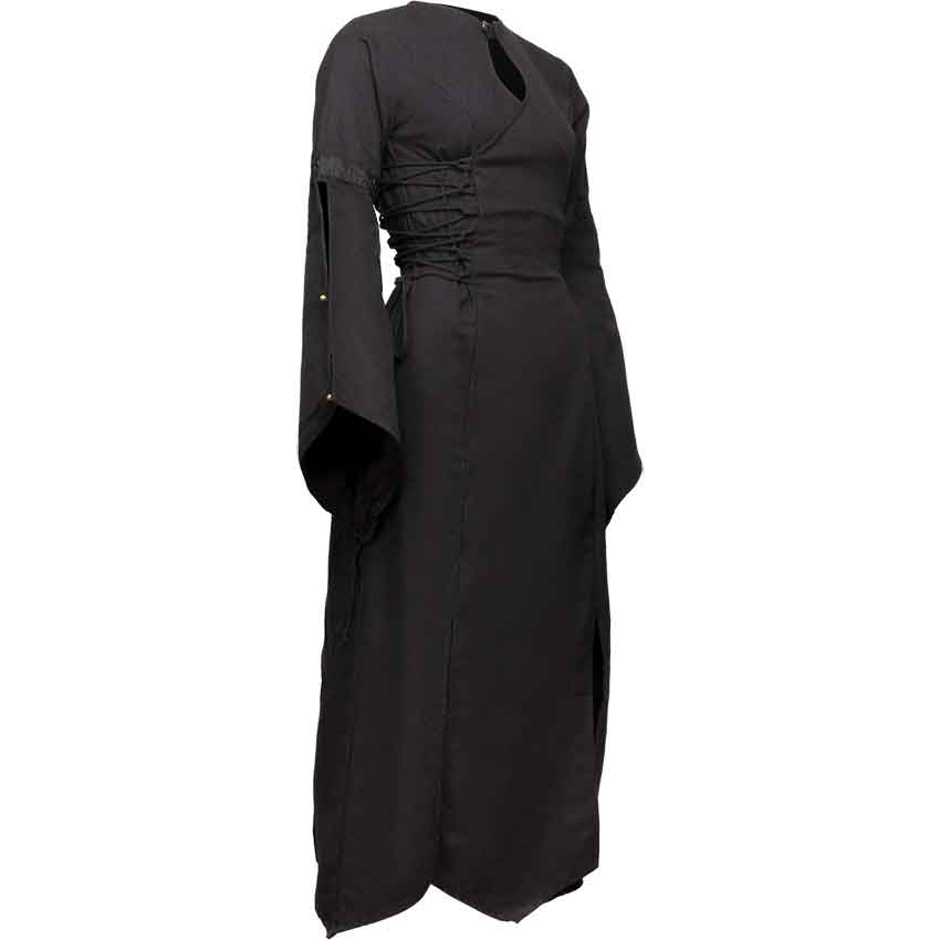 Further down, the sides have lacing for a slightly adjustable fit. Relive history with an authentic medieval dress that’s full length. This medieval gown has hanging sleeves that that close with two buttons along the forearm and can also be opened at the elbow, showing a long, flowing style. Above the elbow, there is a contrasting strip of black embroidered floral trim. There are two slits in the front and in the back, aiding in ease of movement and also making this gown great for layering over a skirt or even another dress.