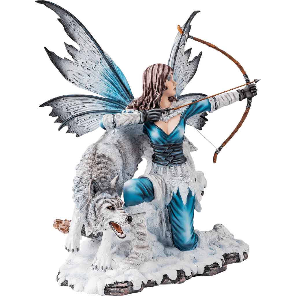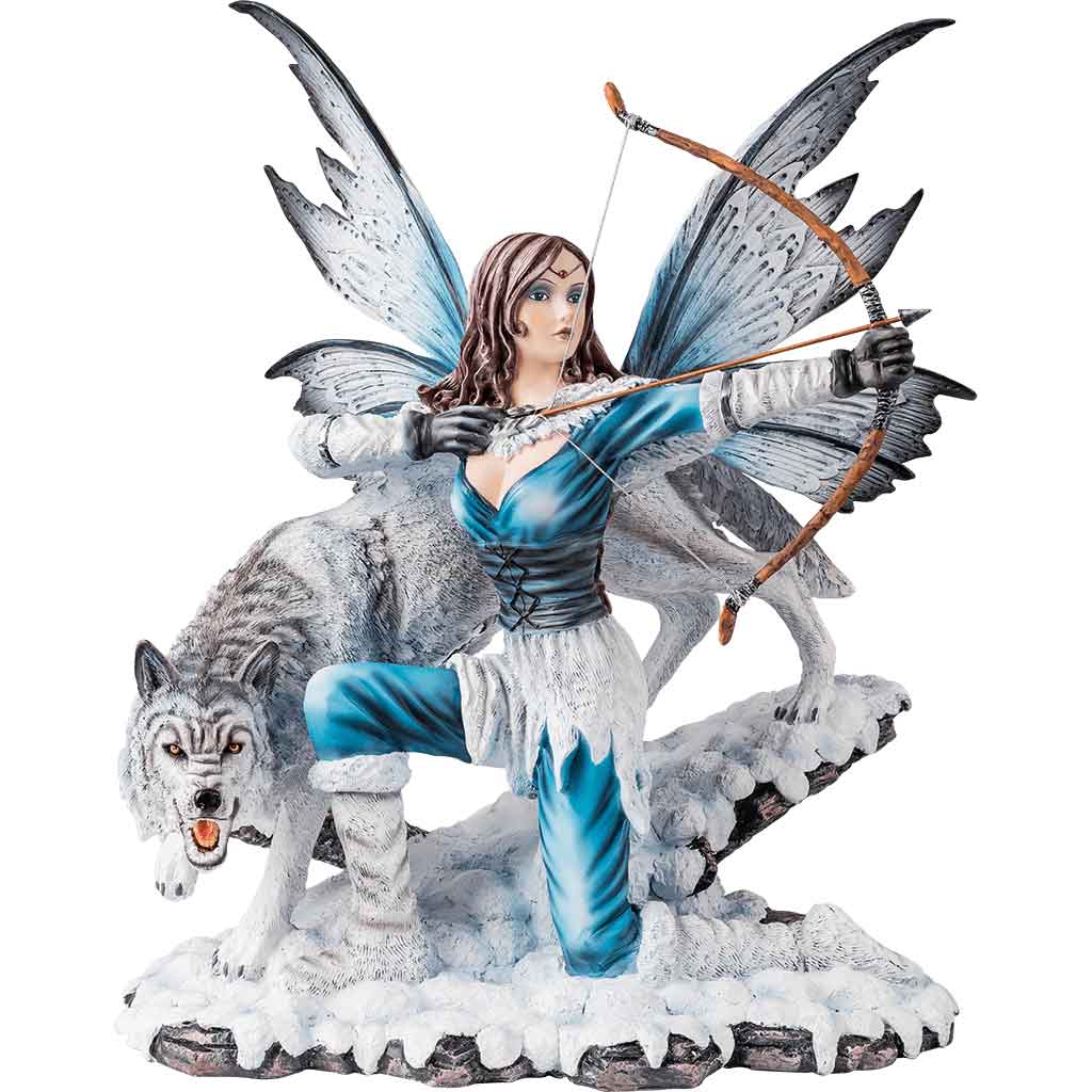 A chilling wind blows and the mournful howling of a wolf pack echoes through the mountains. A curtain of snow parts to reveal the Artic Fairy Archer with Wolf Statue ready to let lose a lethal arrow, prepared to protect her realm. Her black-gloved hands are steady as she unleashes a powerful attack. A canine companion protectively shadows the fairy, growling at the fools that dare to intrude upon their lands. Clothed in the blue and white of winter, the fairy is truly an enchanting sight. White fur makes up her armguards, cloak, skirt, and boots. A black underbust corset girds her waist. A pair of butterfly wings extends from her back. Admire the winter-inspired beauty of this fantasy statue when you incorporate it into home displays or statue collections