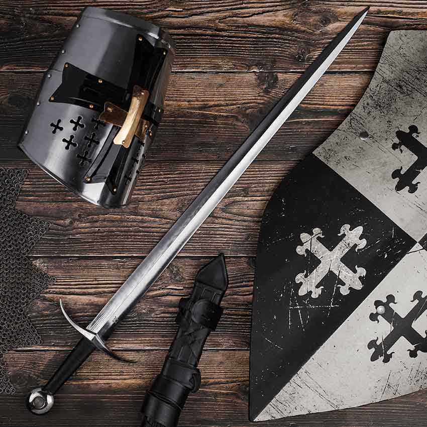 By the 14th century, the classical view of the knights sword took shape in the arming sword. And this Arming Sword with Scabbard demonstrates exactly why, as its pronounced taper and tip make this blade a quick yet devastating weapon. This sword represents the change in warfare during the 14th century, when armor improved to such a point that swords had to change or be cast aside in favor of weapons that could penetrate plates with more ease. This style of blade finds a content medium, combining maximum thrusting power, a narrow point for slipping through armour defenses, and an effective cutting ability. This sword is a Type XVIII (of Oakeshott typology), which means its blade gradually tapers to a fine tip and it has a four-sided, flattened diamond cross section. The blade is dual hardened and forged entirely from 5160 high carbon steel. Highly effective, the guard features long, mild steel quillons with tips that curve upwards towards the blade. The wheel pommel is a classic addition that helps counterbalance the blades weight. The hilt is made of wood scales secured around a full-length tang, which is peened to the pommel, and is finished with leather wrapping for a solid and effective hold. The sword comes complete with a matching scabbard, perfect for containing the blade and keeping it safe when not in use. No sword belt is included, so you can easily attach it to your own favorite belt or baldric. You might say that this Arming Sword with Scabbard earned its name, historically, by being so versatile and so effective that it became an essential aspect of almost every knights equipment.