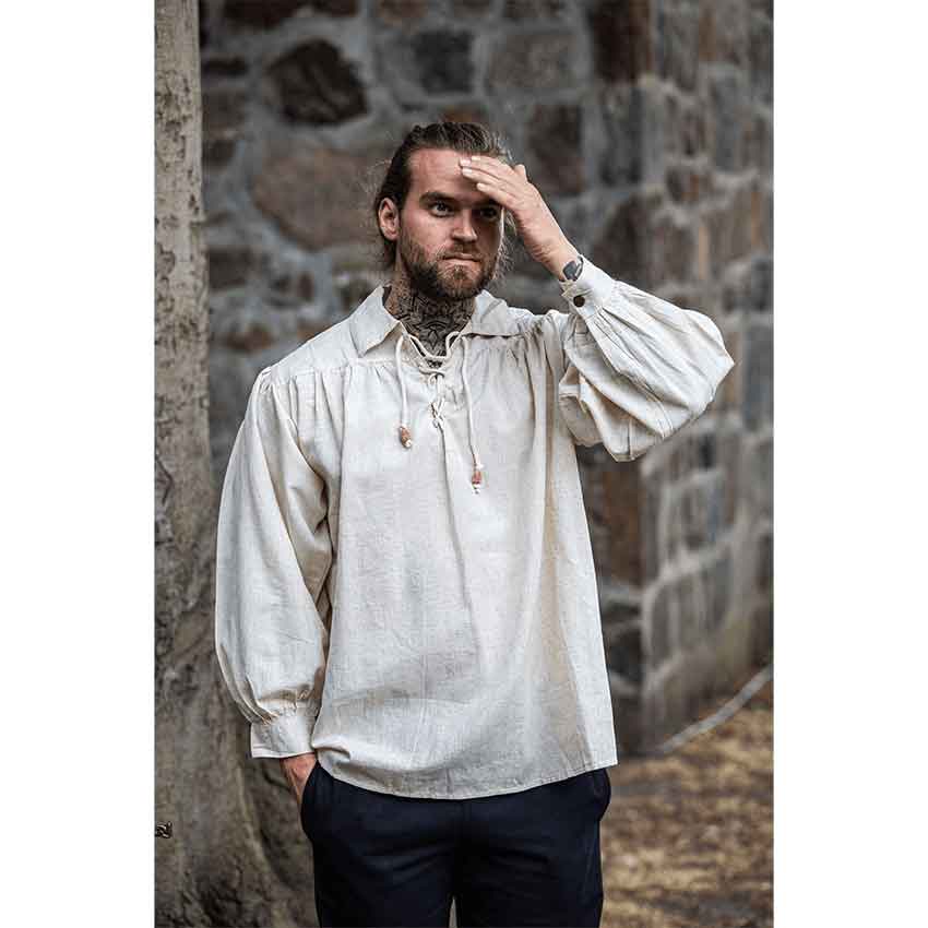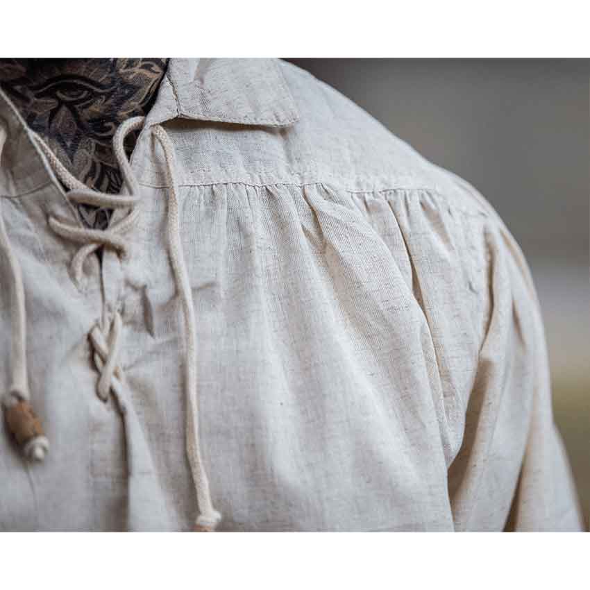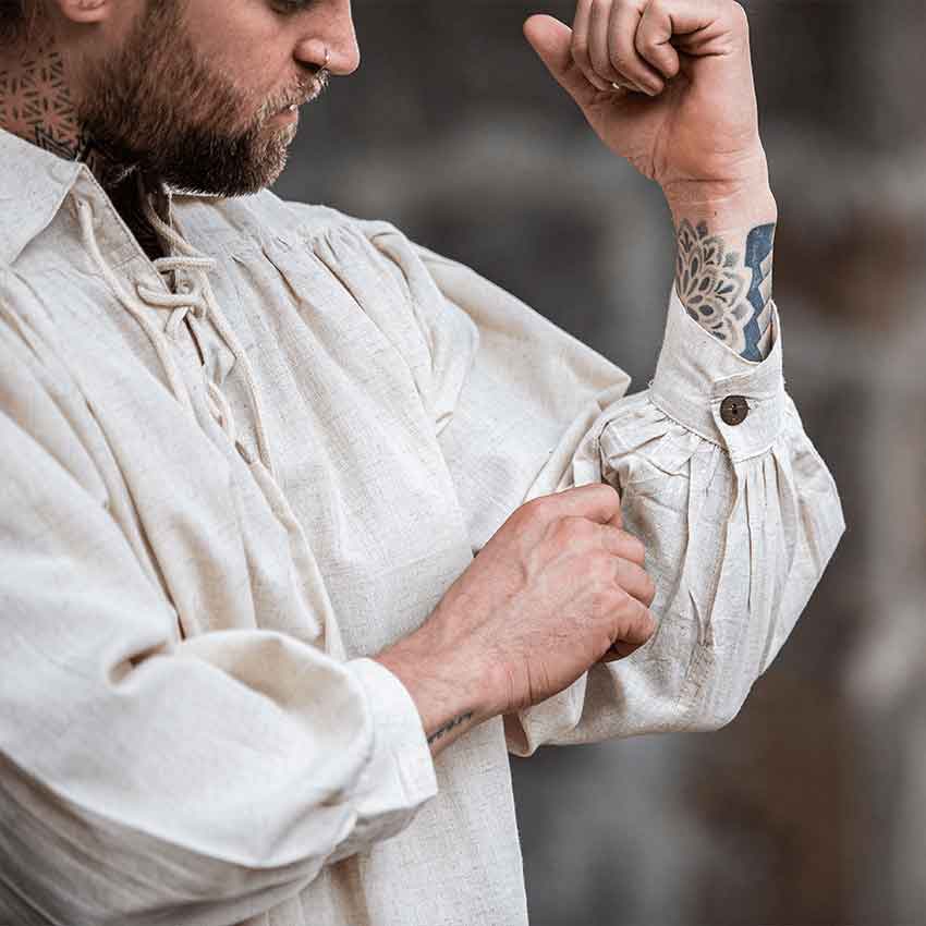 Crafted from a cotton and linen blend, this Artur pirate shirt is designed with long sleeves and all natural materials. Walking through the bustling markets of port cities, this pirate cotton shirt will surely turn your outfit into an eye-catching conversation starter. At the top, this long-sleeve shirt has a classic cut and a broad, tapering collar. Below the collar is adjustable lacing on the front placket. Those laces are capped with wood buttons, guaranteeing they never slip out of the buttonholes. The body of the shirt is gathered just below the shoulders, both front and back, adding style and structure without sacrificing its comfortable, loose fit.
