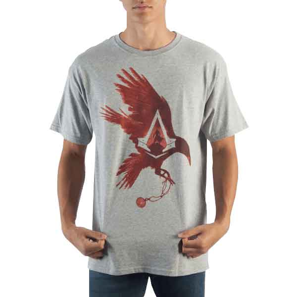 Led by twins Jacob and Evie Frye, the Rook crime syndicate works against the Templar gangs in 19th century London. The Assassins Creed Rook Mens T-Shirt displays an intricate image combining the bird symbol and the game logo. Printed in a dark red hue on a heather gray t-shirt, the flying rook holds a coin necklace in its feet. The Assassins Creed logo appears overtop the rook, an image of an assassin standing on an outcrop appearing within the vee symbol. This gamer t-shirt is the perfect Assassins Creed apparel for fans of the franchise. The comfortable Rooks t-shirt makes a great gift, too.