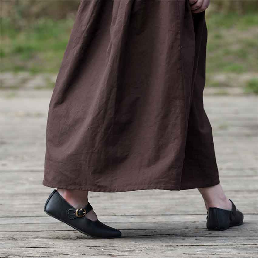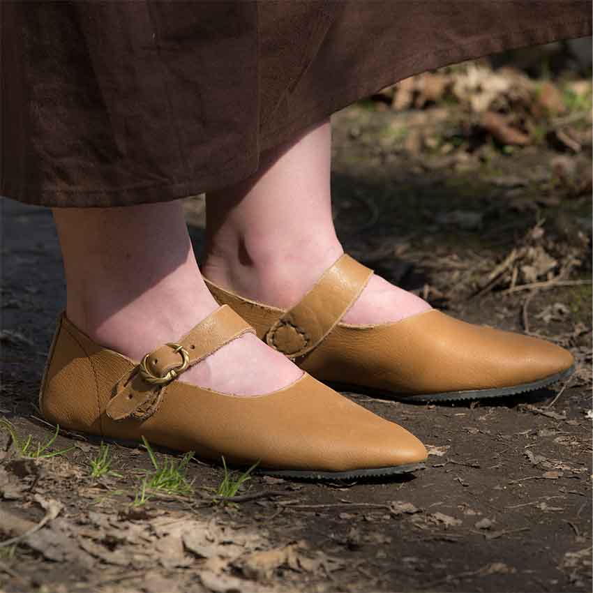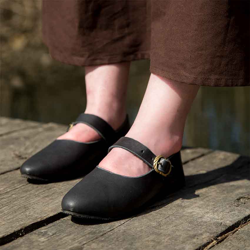 Shoes that are easy to wear and pair with almost anything are a must-have in the wardrobe of a medieval lady. The Astrid Shoes are the perfect flats for medieval, Renaissance, and fantasy looks, handmade from top quality leather. Choose from black and natural colors, and a range of sizes. These medieval ladies shoes have a rounded toe and an adjustable strap across each foot that secures with an ornate brass buckle. The outsole is made of rubber, and the interior is unlined. Whatever your medieval or fantasy persona, be you peasant, princess, merchant, or adventurer, these historical leather flats are essential for LARP, reenactment events, the Renaissance faire, and costume use.