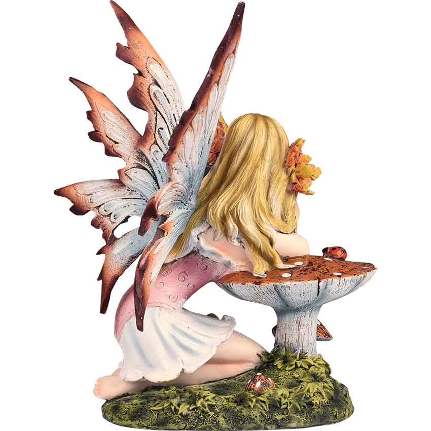 The crisp air and the vibrant leaves of fall are best enjoyed with a dear friend. For the magical nymph of the Autumn Leaf Toadstool Fairy Statue, nothing is as agreeable as a comfortable mushroom and the company of a ladybird. Black speckles and white spots decorate the red toadstool on which the garden pixie reclines. Amber autumn leaves embellish the golden locks of her hair, matching the orange tips that highlight her white butterfly wings. A green armband encircles her left shoulder, and a pink bodice wraps around her short, white dress. The ladybug sits next to its friend, enjoying the change of season in quiet amusement. Join in their cheerful revelry when you add this fairy statue to your fantasy home decor.