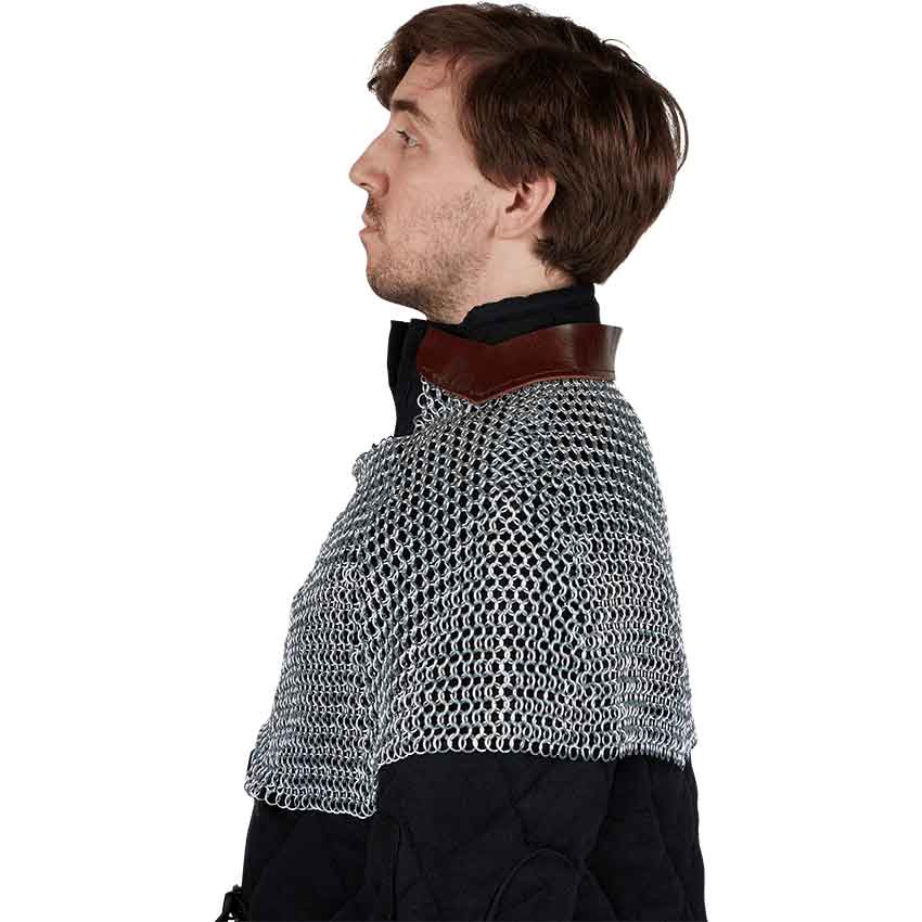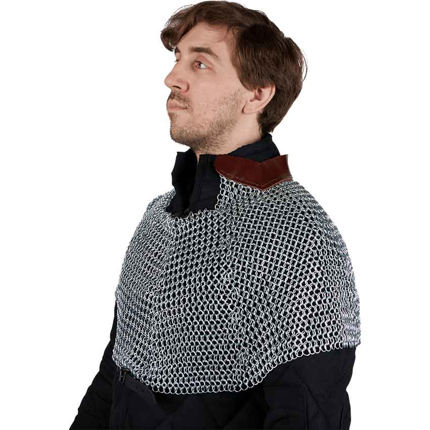 This chainmail mantle features a 4-in-1 pattern construction of butted round rings. A 4-in-1 pattern consists of four chainmail rings woven through another ring. The 8-millimeter rings have a zinc-plated finish. This aventail makes a great addition to any knights armour or medieval armour costume.