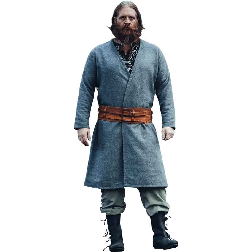Crafted from a wool blend, this simple Viking coat is a great piece that’s as stylish as it is authentic. It’s grey for providing a sophisticated look. At the top, this wool coat has a tapering V-neck collar and an overlapping front. Layer one side of the coat over the other and secure with a belt for a unique look. The long sleeves extend down to the wrists. Available in multiple sizes, this Norse coat accommodates a wide variety of body types. This long jacket ends around the calves for most.