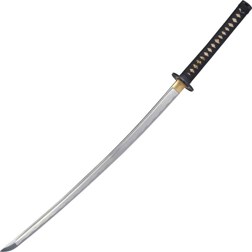 You, proud and brilliant warrior, know when to blend in with your surroundings while waiting for the enemy. You wield the Bamboo Engraved Saya Katana. Hand forged from 1045 carbon steel, this sword is fully functional. It features the curved blade typical of Japanese swords. A fuller runs along the blades spine. The blade enters the handle at a black tsuba. The tsuba has a unique bridge over water design. Next, the sword features a black, wrapped handle with gold-colored accents. In addition, the sword comes with a matching black scabbard called a saya, a sword bag, and a certificate of authenticity. On the saya, there is a carved bamboo pattern. This functional sword looks great on the battlefield and on a wall in your home. You can also proudly display it in your office space as well.