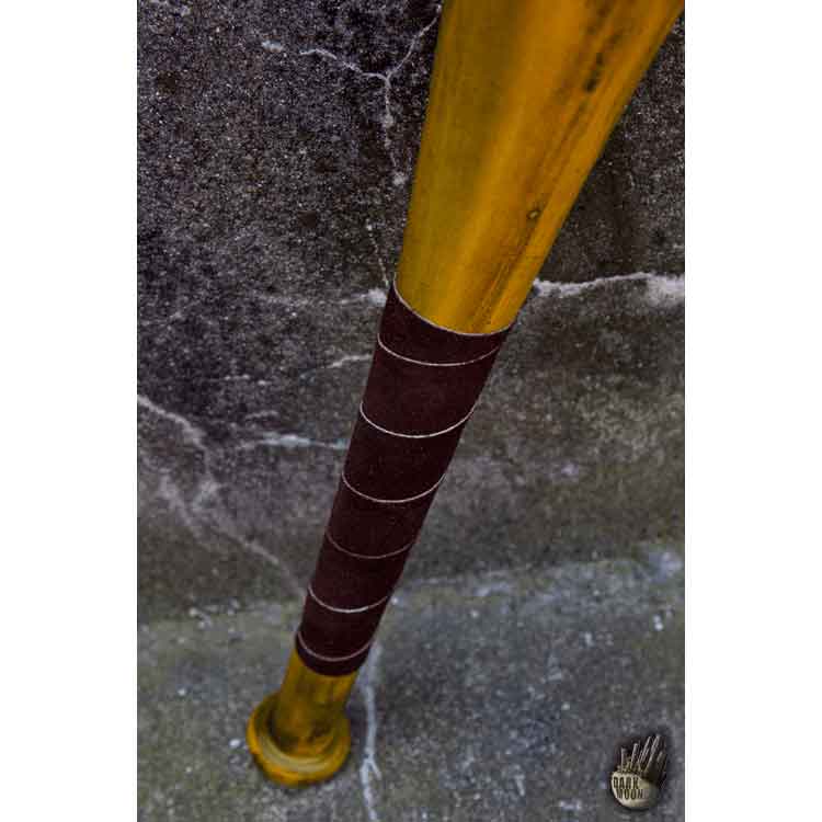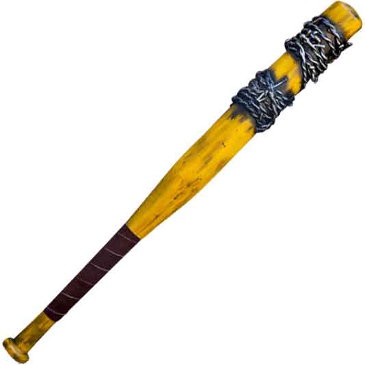 In a post-apocalyptic world, you may need to add a bit more danger to your everyday weapon. Wield this Yellow Barbed Wire LARP Bat in your defense. Made from soft EVA foam, this LARP bat has a fiberglass rod core with a Kevlar core tip. A latex coating covers the foam. This foam bat looks like its real-life counterpart with some differences. A soft leather grip wraps around the handle. The handle ends in the usual knob found on a bat. On the batting end, two sections of faux barbed wire appear to wrap around the bat. In addition, there is a dark finish for a more rugged and worn appearance. This finish especially occurs underneath the faux wire. The Yellow Barbed Wire LARP Bat works great for LARP events, cosplay conventions, and theatrical use.