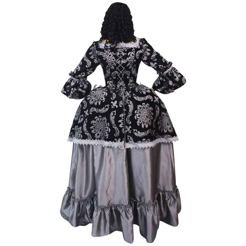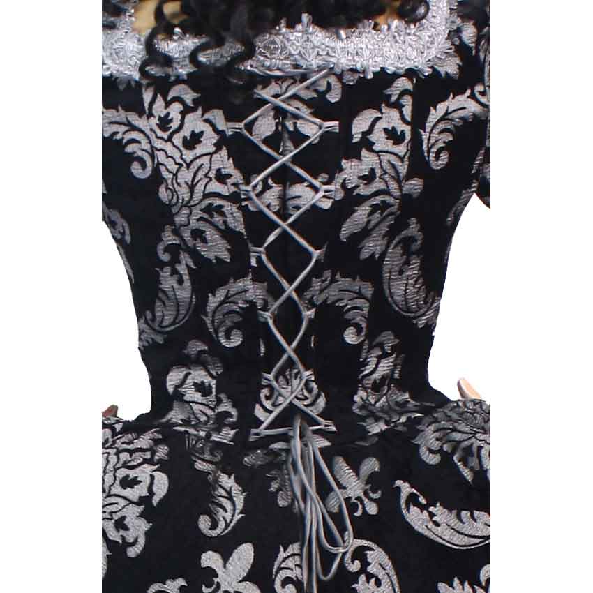 Expertly handmade with intricate attention to detail, the Baroque Queen Renaissance Dress radiates the exquisite aura of royalty. Inspired by the Baroque styles of French Renaissance fashion, this dress is truly fit for a queen. This Renaissance dress consists of one easy to wear piece, though the brocade fabric featured on the sleeves, bodice, and short overskirt appear as though layered over a long, full-skirted taffeta dress ending in a wide ruffle detail. Lace-up detail on the back and front of the bodice allow for custom adjusting, and inner boning helps you achieve your ideal historic silhouette. Intricate lace decorates the square neckline of the bodice and the edges of the overskirt, creating a regal, incredibly detailed appearance. Wear the Baroque Queen Renaissance Dress to your next sophisticated reenactment event, Renaissance festival, masquerade ball, or even as a theatrical costume. To achieve the voluminous, wide-hipped look of the skirt shown here, wear the Renaissance Pannier (MCI-241) underneath the dress, sold separately.