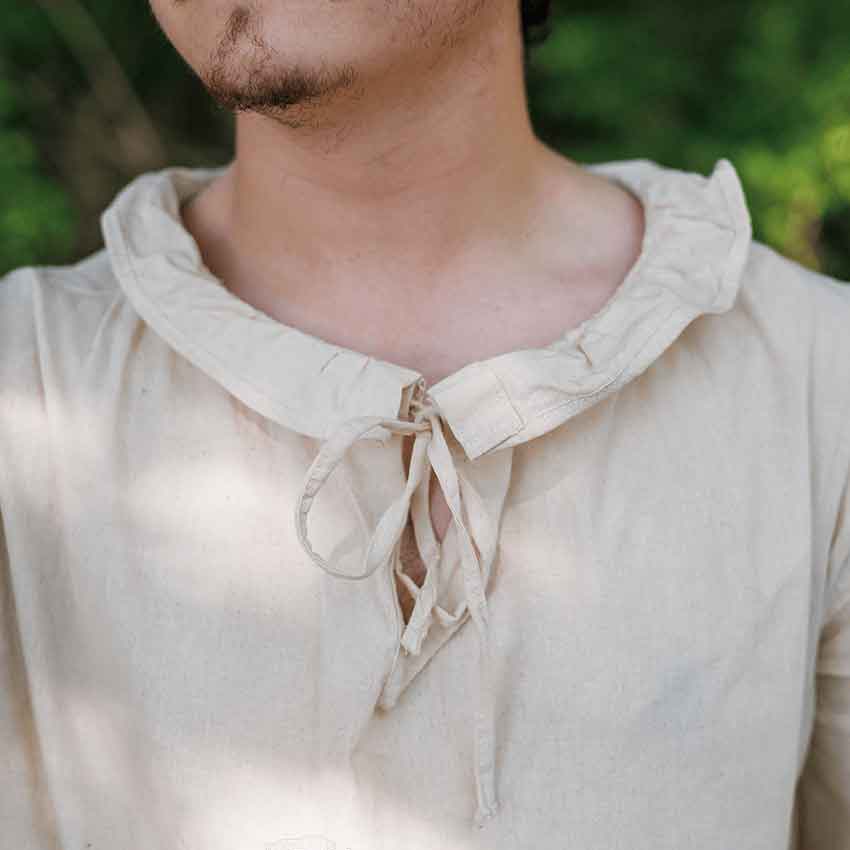 Made from light cotton fabric, the Bastian Shirt makes an excellent piece of medieval apparel for warm days at the Renaissance fair. The period shirt features a wide cut with a subtly ruffled open collar that laces at the neck. The long-sleeved shirt also ties along the sleeve cuffs, offering another touch of style. Available in black or cream color options, the cotton shirt can easily be made to suit peasants, noblemen, or even pirates! Just add the right accessories to transform yourself into a fantastic historical character.