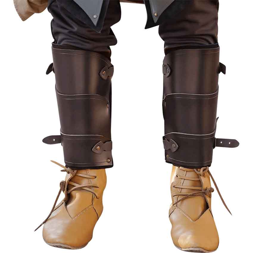 Made of genuine leather, these greaves offer both style and protection. The overlapping plates running up the shins provide an authentic medieval look, while the riveted plates ensure durability and safety during intense battles. Sold as a pair, these greaves secure comfortably with buckled straps, allowing for a secure and adjustable fit.