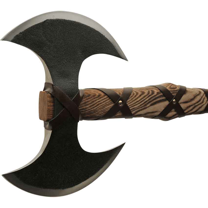 Forged from stainless steel, this axe has a distinct rustic aesthetic. Stainless steel is renowned for its durability and resistance to rust. The double-headed blade has a sophisticated black finish with a silver “cutting” edge. The blades are wrapped with faux leather to the handle. More faux leather wrappings are seen going down the ash wood handle. The handle has a burnt and blackened finish for added depth and style. Toward the bottom, faux leather wrappings form a solid grip. This two-headed battle axe comes with two brown leather sheaths; one for each blade.