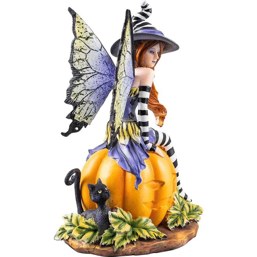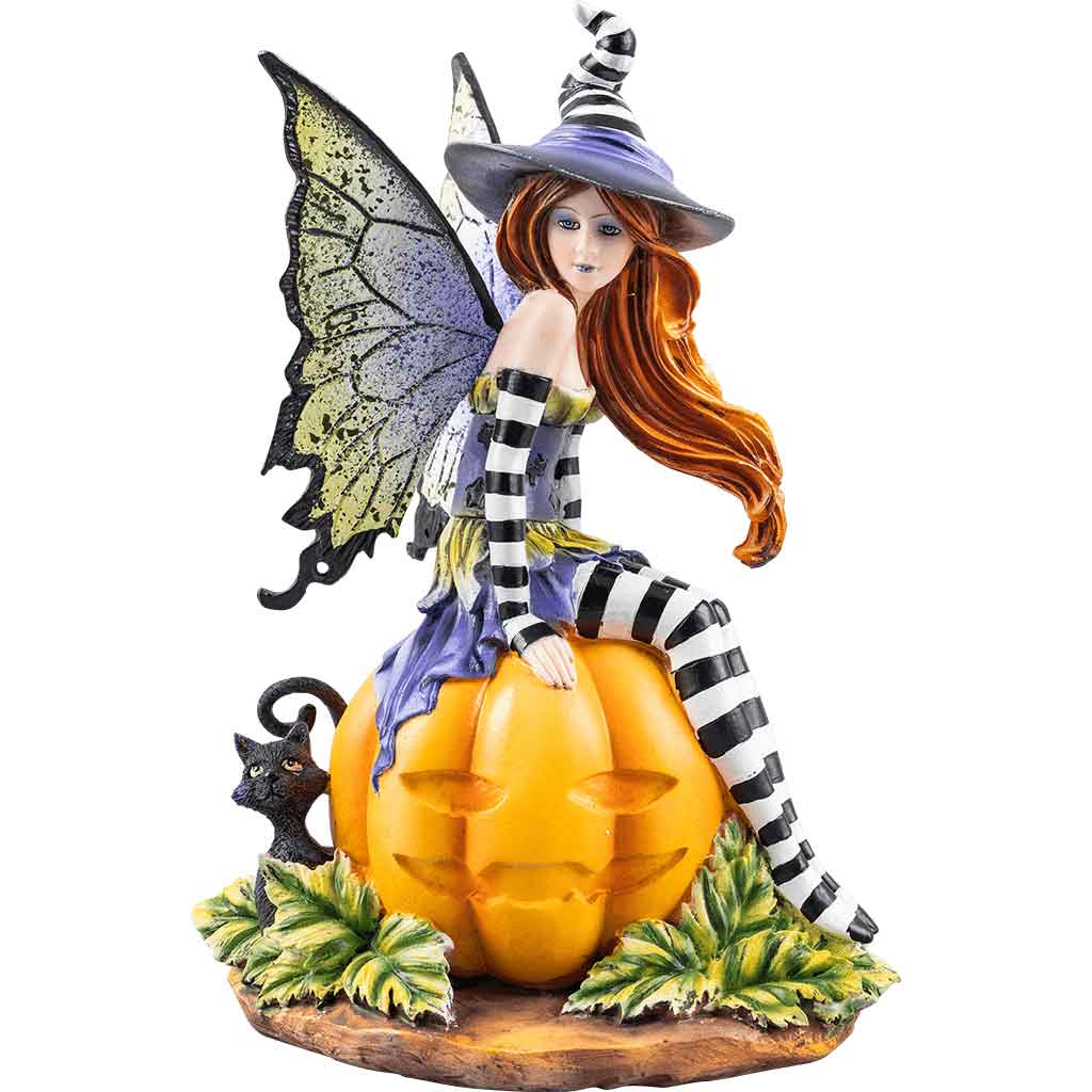 Fairies, just like people, love to celebrate the holidays, including Halloween! Check out the Bewitching Fairy Halloween Statue. Made from cold-cast resin, this hand-painted Halloween statue depicts a design by the artist Amy Brown. It features a fairy sitting on a jack-o-lantern. She wears a short, purple, starry dress. She also wears white-and-black striped stockings and arm warmers. Her pointed witch hat matches the rest of her outfit. It has a purple base with a black-and-white top. The brunette fairy has a pair of purple butterfly wings with black details. Meanwhile, the orange jack-o-lantern sits on a patch of brown ground. There are green pumpkin leaves around the base of the pumpkin. A black cat sits on the side of the pumpkin. This fairy statue makes a great addition to any fantasy decor or fairy statue collection.