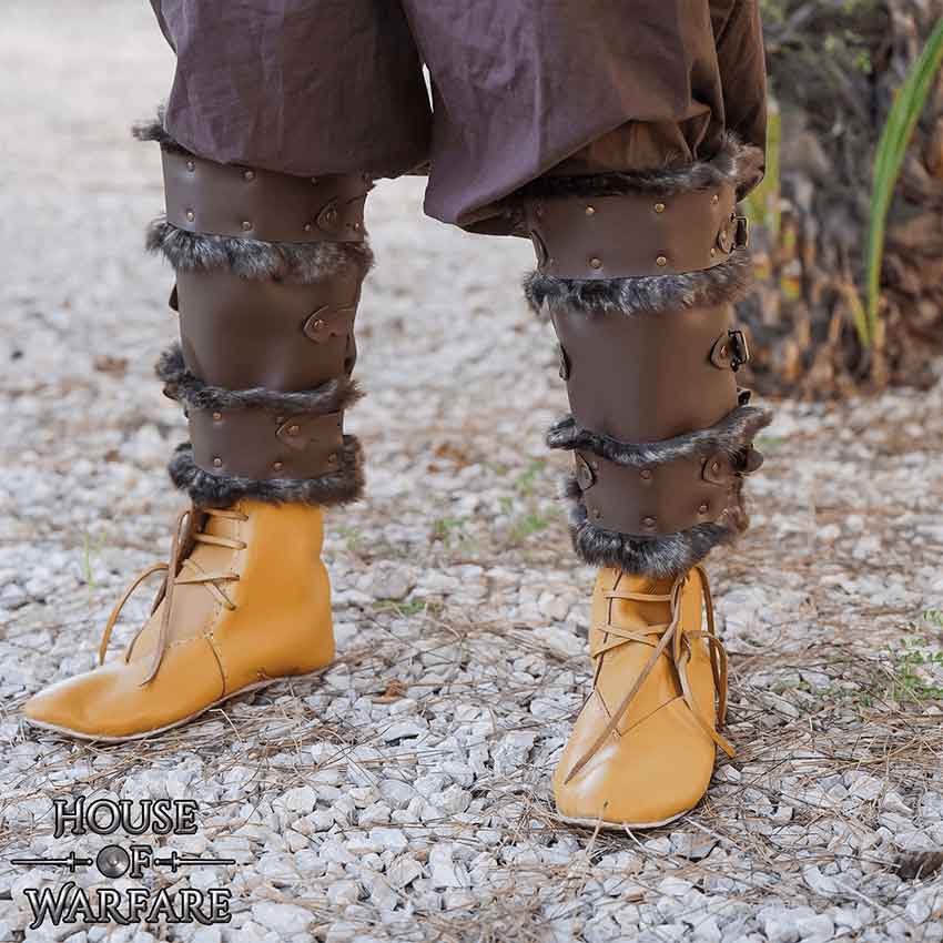 Whether you are engaging in epic battles or commanding kingdoms, the Bjorn Fur Trim Leather Greaves in Brown are the perfect addition to your ensemble, embodying strength, style, and a touch of untamed allure. Prepare to conquer the realms with unmatched confidence and power! These greaves are designed for those who seek both protection and style on their epic adventures.
