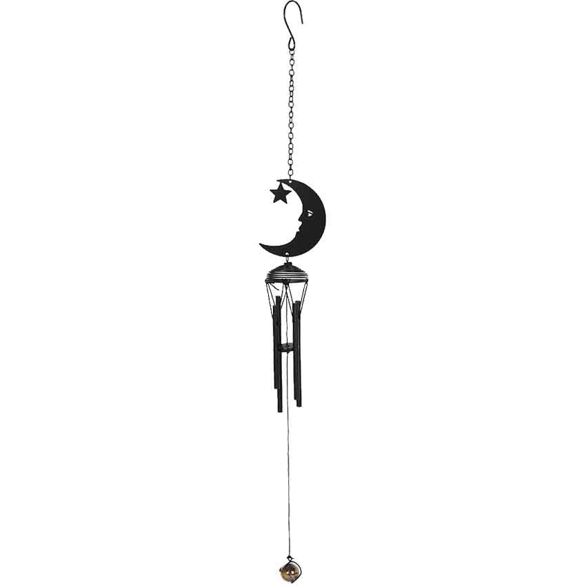 Hanging down from the moon is the wind chime. Each pipe of the chime is a different length. There is a ringer for the chime in the center. The ringer ends with a ball inside of a spiral. You can add this wind chime to your garden. This wind chime makes a great addition to any Wiccan decor or collection.