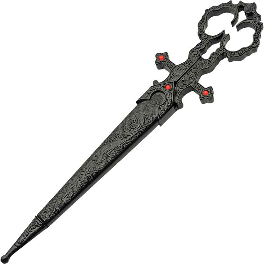 Forged from stainless steel, these Renaissance scissors have a cruciform style with jeweled accents. Stainless steel is renowned for its durability and resistance to rust. The hand piece has a sophisticated black finish with intricately embossed scrollwork. The cruciform guards have red faux jewels embedded in them. These black cross scissors come with a black scabbard. The scabbard has intricate scrollwork embossed on it and a red faux gem at the locket. The chape also has intricately embossed scrollwork.