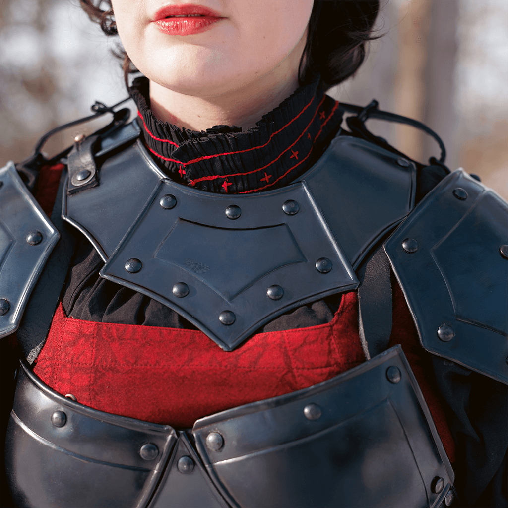 The Blackened Mina Gorget makes a good option for warrior princesses, shieldmaidens, and lady knights heading to battle. The steel gorget displays a dark metal finish that looks great with the decorative rivets that frame the piece. Buckled straps on the sides of the womens gorget can be used to attach spaulders, such as the matching Blackened Mina Spaulders (MY100066) or other shoulder armour of your choice. In addition, it has a strap that latches onto a post for fastening the gorget around the neck.