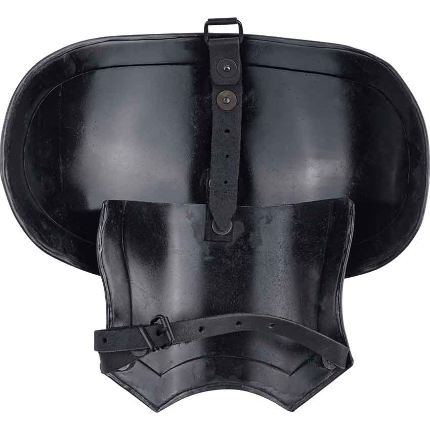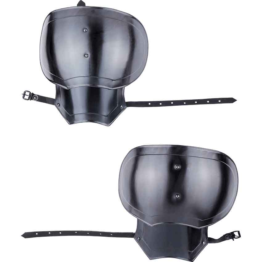 Perfect for a variety of characters, you can step into the shoes of your favorite dark medieval fantasy characters to cosplay when wearing these steel armour spaulders. As part of a set of Blackened Undead armor pieces, these spaulders attach the best to the Undead Torso Armour #MY101683. If you’re looking for additional pieces in the set, be sure to check out the Blackened Undead Helmet #MY100084. While these spaulders are best paired with other black Undead armor pieces, you can enjoy their unique presence on any gorgets or cuirasses that are compatible. When purchasing armour pieces, in order for the pieces to be compatible, it is best to stay within the brand. These black steel spaulders are great for completing your dark knight or undead warrior character concept. Engage in epic LARP battles with confidence wearing these black steel shoulder armour pieces. The straps ensure these spaulders stay in place during intense battles or walking through Renaissance fairs. Keep in mind, the oil coating the spaulders may also cover the straps, so take caution to wipe away excess oil on the straps.