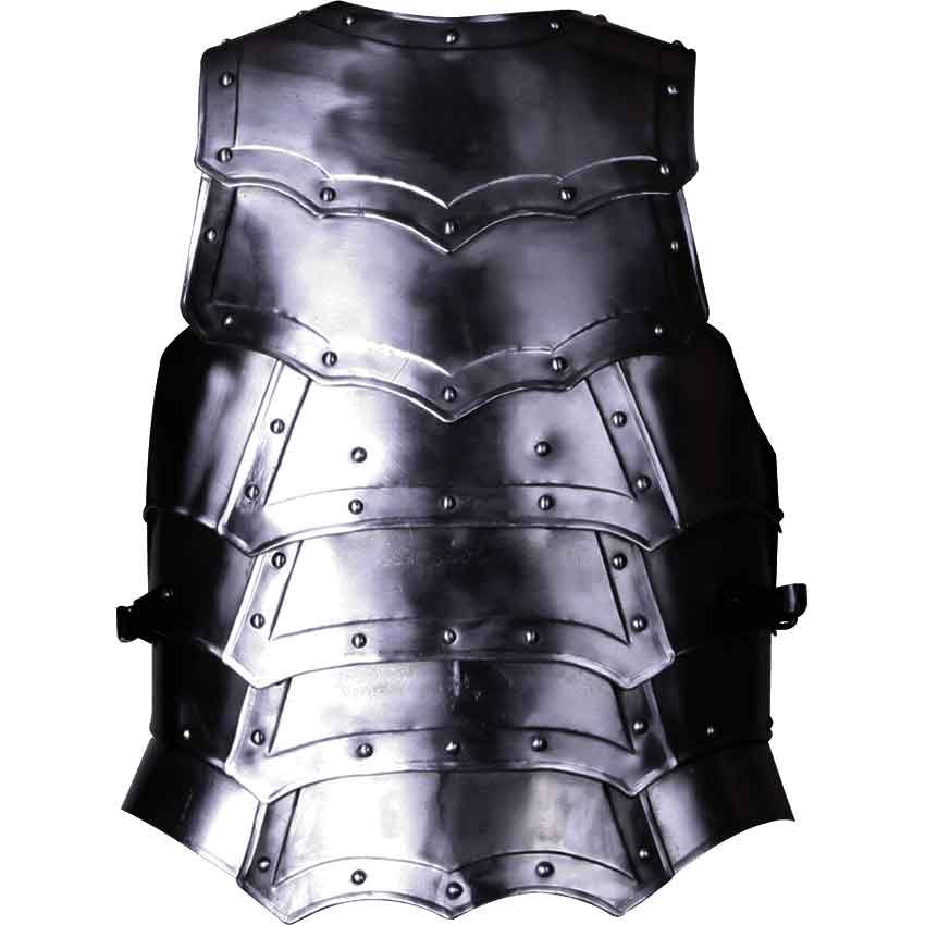 Protect the core of your body when you head into battle with the help of excellent plate armour like the Blackened Vladimir Cuirass! The steel cuirass is composed of multiple flexible segments showing a dark metal finish. The interlocking components allow more freedom of movement to the wearer than regular plate body armour. Each of the segments is framed by deepened edges and decorative rivets, lending the torso protection a distinctive look that goes great with our other Vladimir-style armour. The breastplate and backplate are connected with leather straps. We recommend wearing a gambeson or other padded arming wear with this torso armour to maximize comfort. The metal cuirass is ideal for LARP events, re-enactments, and Renaissance fairs.
