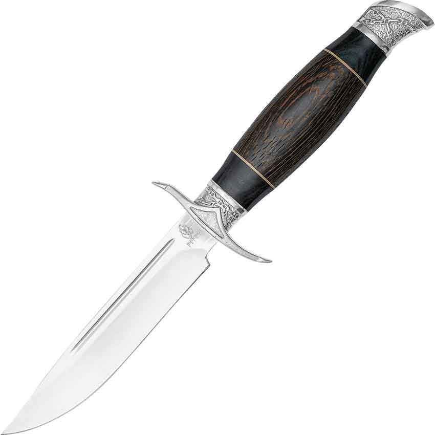 The middle of the wooden handle is black with two darker black sections on either end. This gives the knife a rugged charm. The middle of the handle is convex so it conforms to your grip. At the bottom, the silvery pommel curls toward the blade and is also textured with chain links. This hunting knife comes with a brown leather sheath. The sheath has two brass-tone studs securing it and a handle clasp at the top.