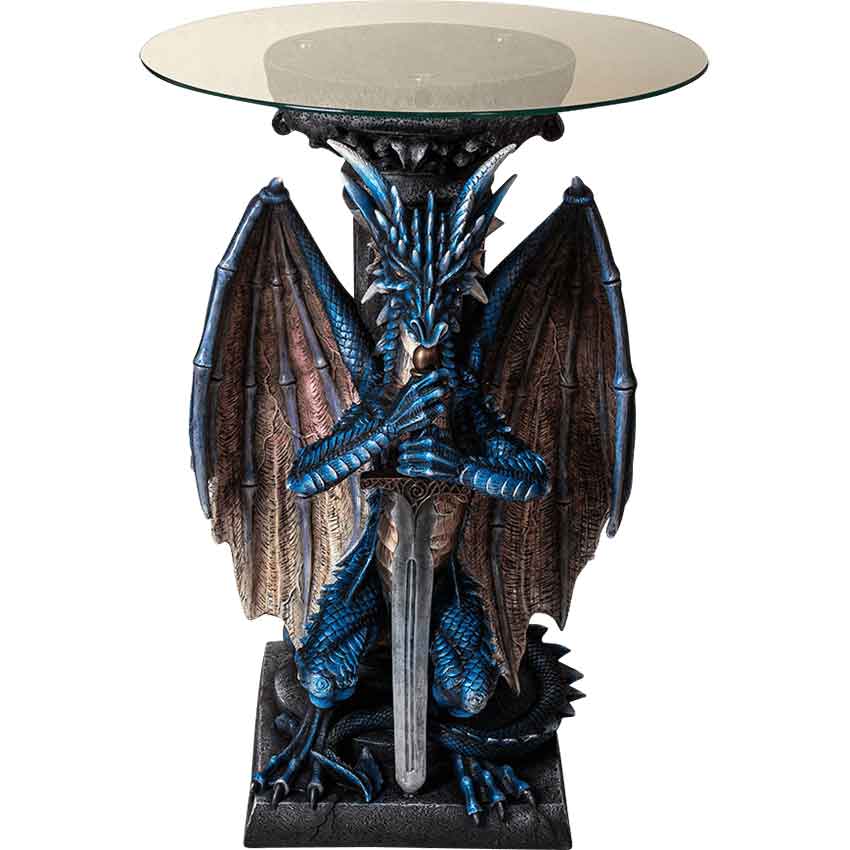 Meet the Blue Guardian Dragon with Sword Table, a stunning and practical addition to your home decor. Rest assured this mighty protector offers your abode a distinct medieval fantasy charm.