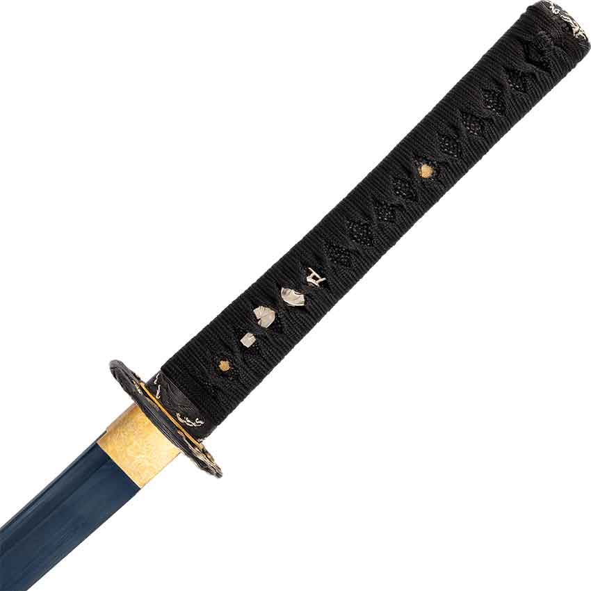This blue wave samurai sword comes with a black, lacquered wood saya, also known as the scabbard. The scabbard has black sageo cord, referring to the cord tied around the scabbard for tying to your belt. Splashes of blue and white add color to the black scabbard. This samurai sword also comes with a black display stand designed to hold the sword on both sides.