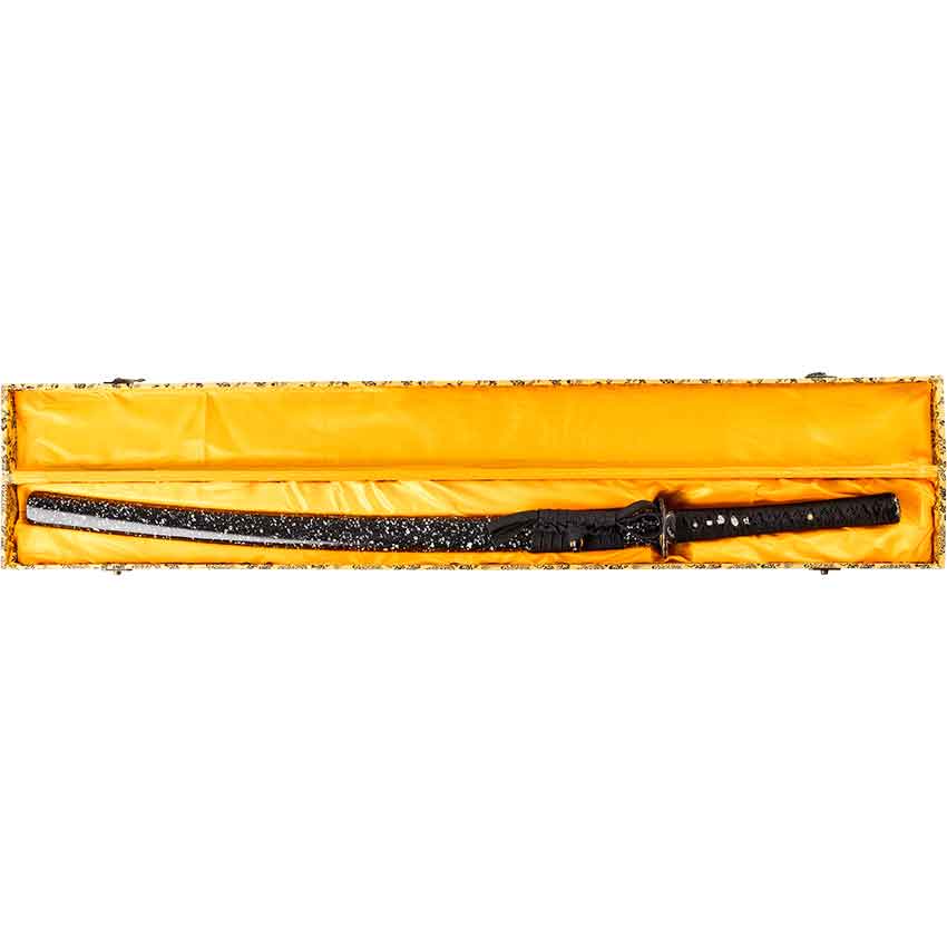 - Secure Saya Scabbard: Sheathe the blade in the black lacquered wood scabbard.