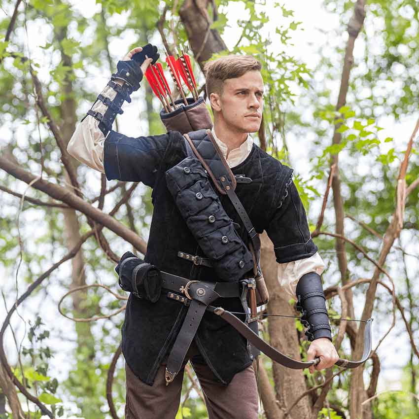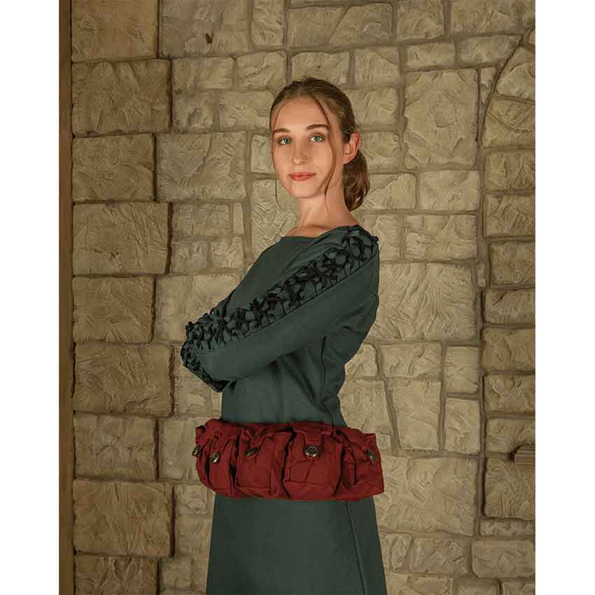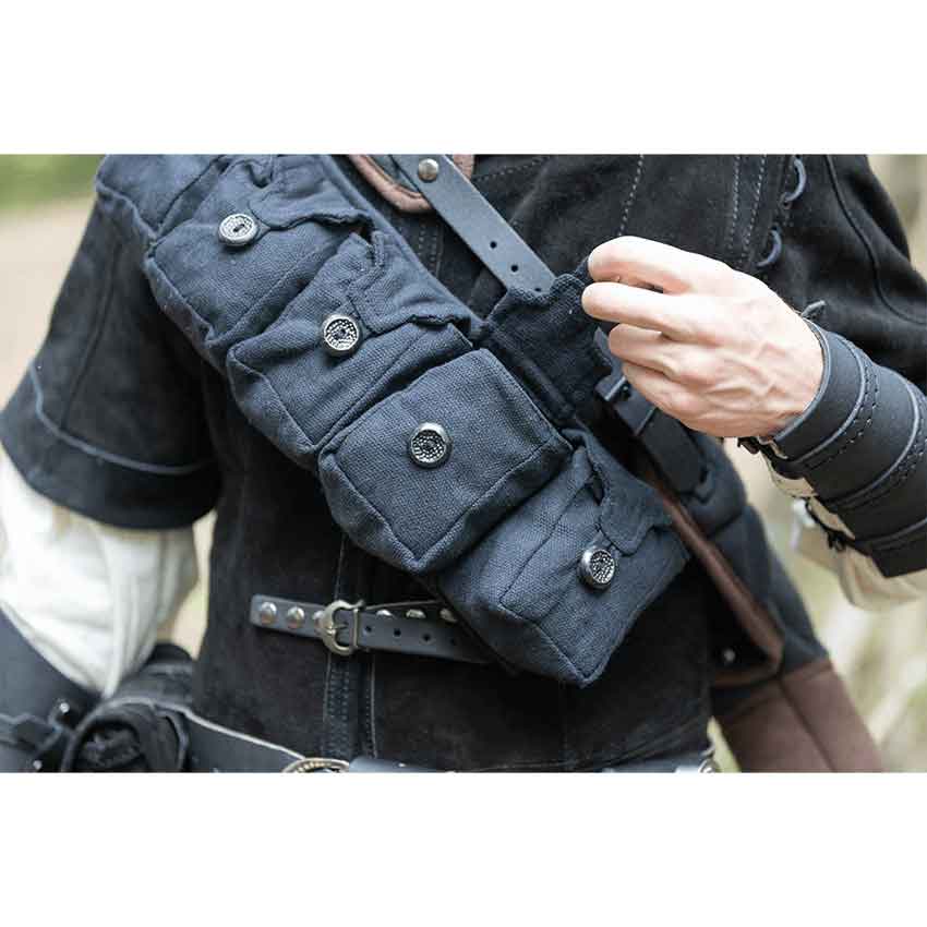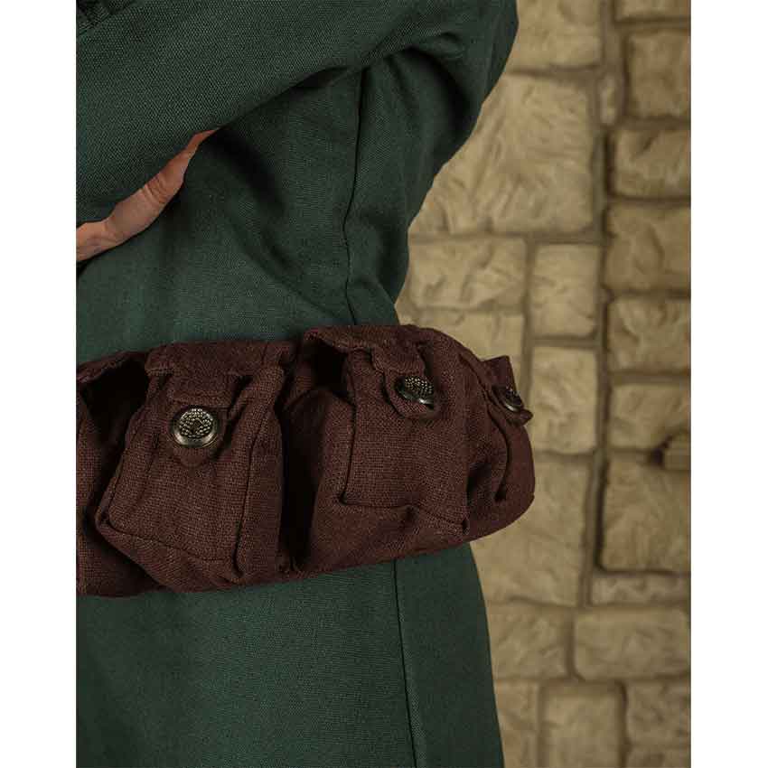 Many characters need a place to keep their important items. From alchemists to mercenaries and more, keep your things in this Borchard Pouch Belt. Made from heavy duty canvas, this bag belt comes in five colors. It has five bags attached to a belt strap. Each bag has a tab-shaped front flap. The front flaps close with round buttons and loops. The set of pouches has a strap on the back. The bag belt secures on the body with the strap and two D-rings. The Borchard Pouch Belt adds some practicality to a variety of costumes for many occasions. Wear it to a LARP event, cosplay convention, or Renaissance faire.