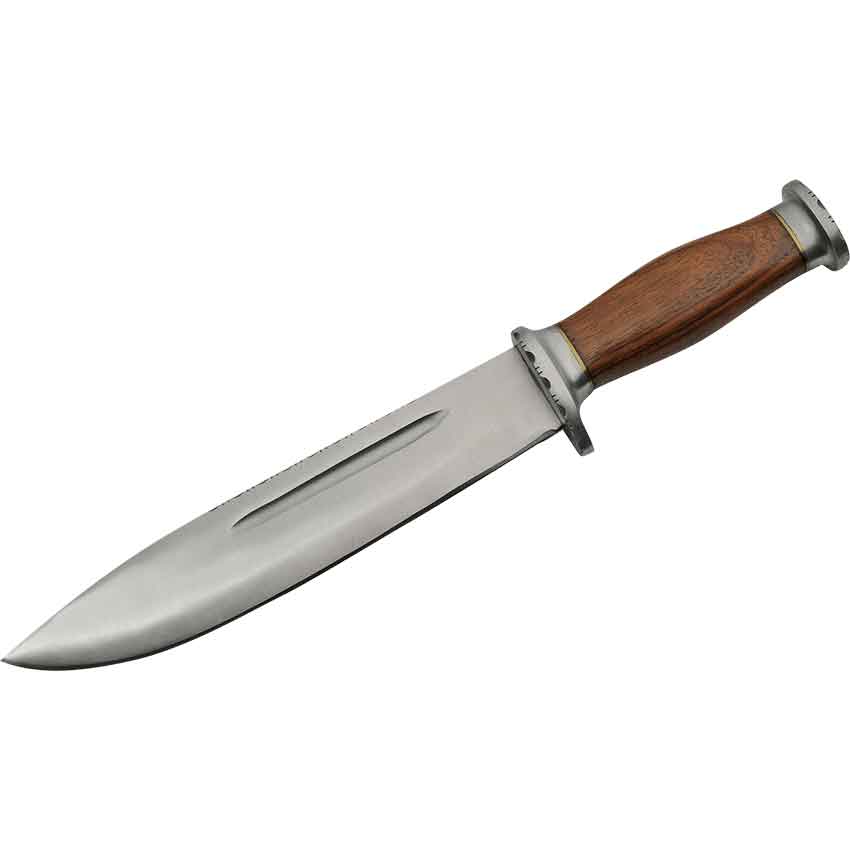 The Bowie and Cutlery Set makes it easy to take a functional blade with you and to feast when you are on a grand adventure. Made from stainless steel, this set includes a bowie knife as well as a smaller knife and fork. The bowie has a drop-point blade. There is a short fuller near the middle of the blade. Just above the fuller, filework adorns the spine of the blade. Filework also adorns the short crossguard of the knife and the pommel. The steel guard and pommel have curves near the grip that help to not only keep the hand on the knife but also makes the grip more comfortable. The wooden grip continues the curved shape.