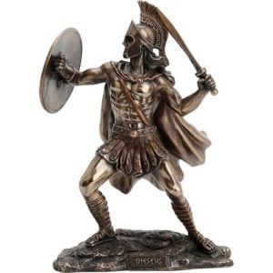 There are many warriors in Greek myths. The Bronze Greek Theseus Statue depicts one of these mighty heroes ready for battle. Made from cold-cast bronze, this hand-painted statue shows the mythical Hero of Athens holding a sword in his left hand. He holds the sword so that the blade is just behind the left of his head. Theseus has a shield in his right hand. He holds it out in front of him. Also, Theseus wears a crested helmet as well as other pieces of armour. The helmet has a red crest. He stands with his legs apart, bracing for battle. Underneath him is a stone-like platform. The platform reads Theseus. This statue looks right at home in an ancient Greek décor or mythology collection.