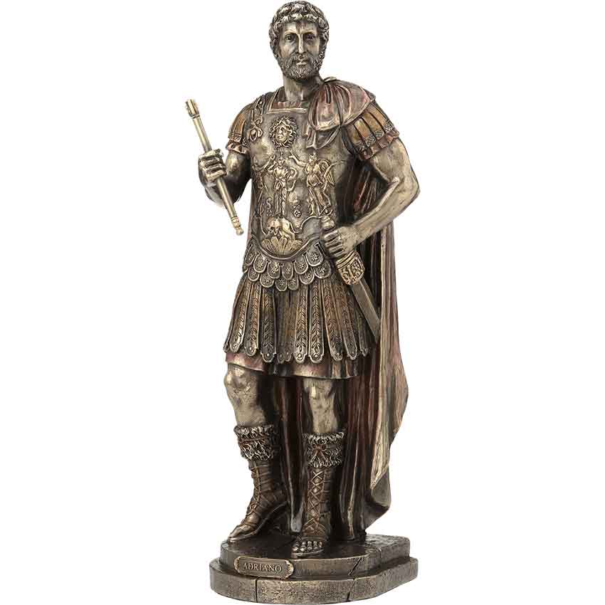 The Roman emperor Hadrian was known for his love of traveling and his benevolent reign, earning him a place among the Five Good Emperors. You can pay homage to this gracious ruler when you put the Bronze Hadrian Statue on display. This bronze figurine portrays Hadrian, called Adriano in his native tongue, standing in ornamental armour. His calm face is framed by his curled hair and beard, and a long, red-colored cape is draped over his shoulder. In one hand, he holds a scroll, and the other is placed on the gladius holstered at his hip. The Bronze Hadrian Statue makes a fantastic piece of Roman home decor and is sure to please any history buff.