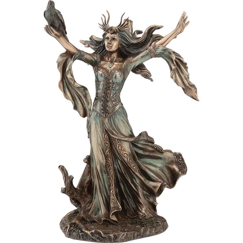Morgan the Fairy is a timeless symbol of witchcraft and other mystic arts. Crafted from cold cast bronze and painted by hand, this Morgana statue depicts the sorceress herself with arms outstretched as if casting a powerful spell. Adorning the head of this statue is a crown of intricately carved horns. The Morgan Le Fay statue’s hair, highlighted with bronze and shaded with darker contrast, billows behind her in the imaginary wind. The bronze statue has its hands outstretched. In her right hand, Morgan Le Fay holds a raven. The raven is an ancient symbol of mystic lore and medieval magic. Like Morgana, the raven also represents death, change, and magic. The bronze raven has realistic feather textures for added depth and dimension.