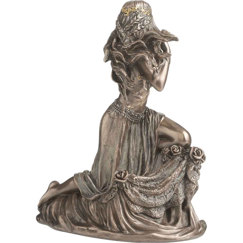 Salome kneels on a bench draped with textured fabric. This drape is accented with roses and baroque damask carvings. Damask refers to flowers and filigree on the fabric texture. Salome’s long skirt elegantly flows down to join the base. There is a plaque that reads “Salome” in Greek-style font. The elongated fabric base allows you to place this Salome statue on most flat surfaces.