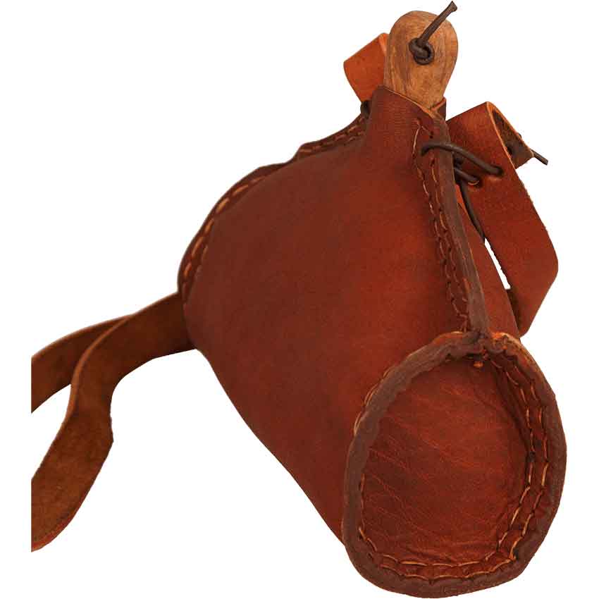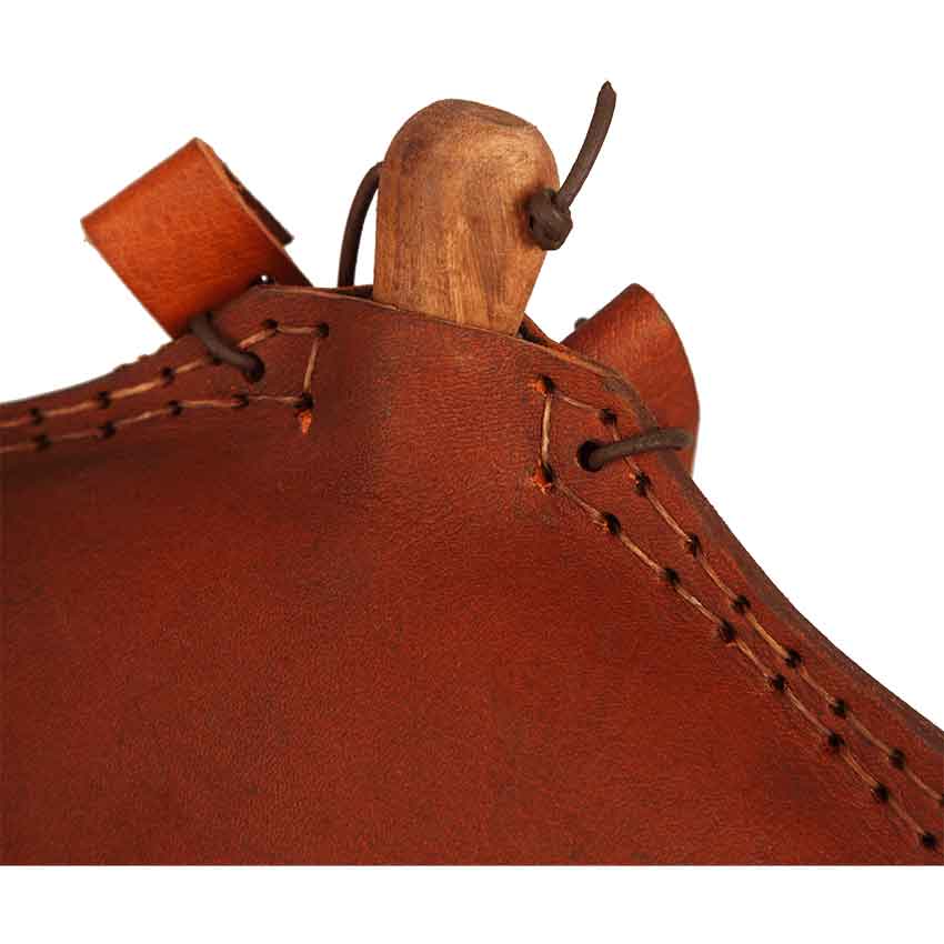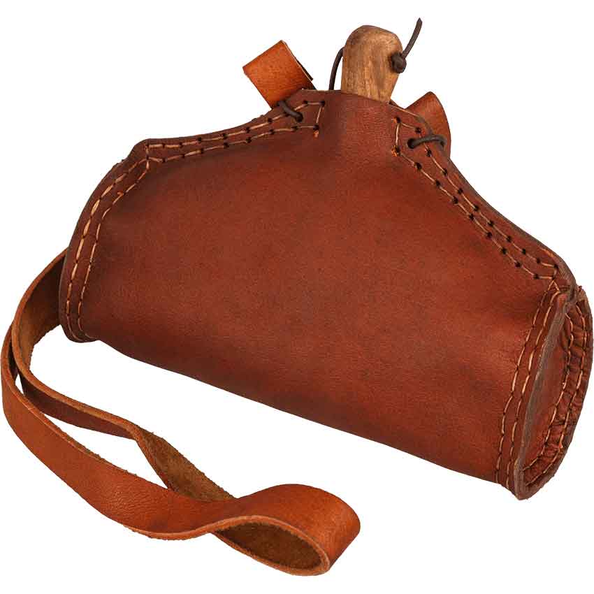 Ensure that you keep yourself hydrated on your quest or during your next reenactment by drinking from the Bruna Water Bottle. Made from leather, this medieval water bottle comes in two color options. It contains a PET inlay, making the bottle safe for drinking from. A wooden plug secures it closed.